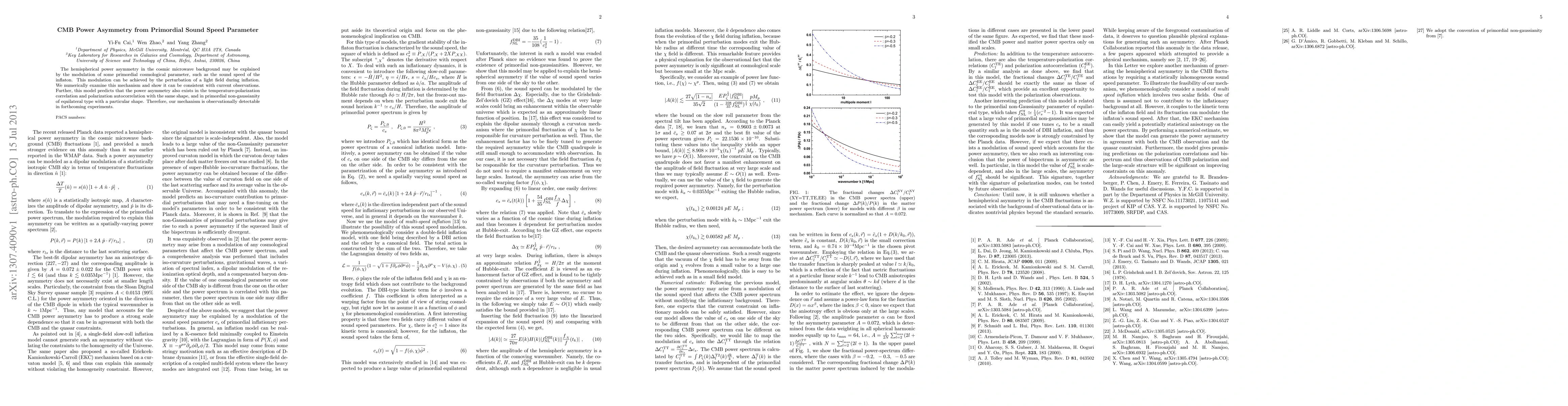 This paper explores how a modulation in the primordial sound speed parameter during inflation can explain the cosmic microwave background's hemispherical power asymmetry. The proposed mechanism is consistent with current observations and predicts detectable signatures in temperature-polarization correlations, polarization autocorrelation, and equilateral type non-Gaussianity.