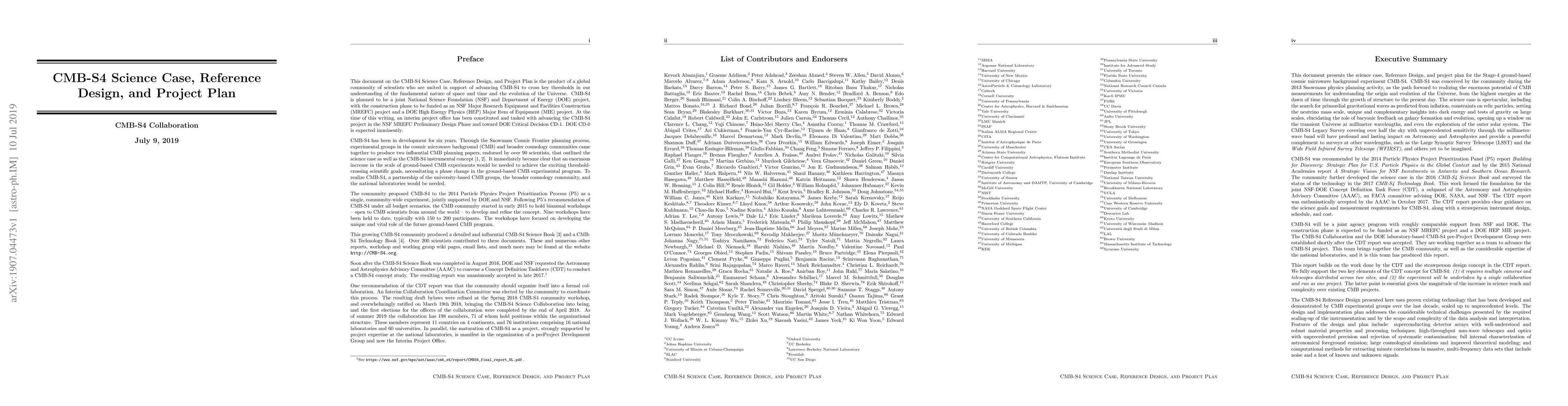 This CMB-S4 science case, reference design, and project plan build upon previous Stage-3 experiments, incorporating new technologies and design choices to address unique measurement challenges in ultra-deep survey B-mode polarization measurements at degree scales.