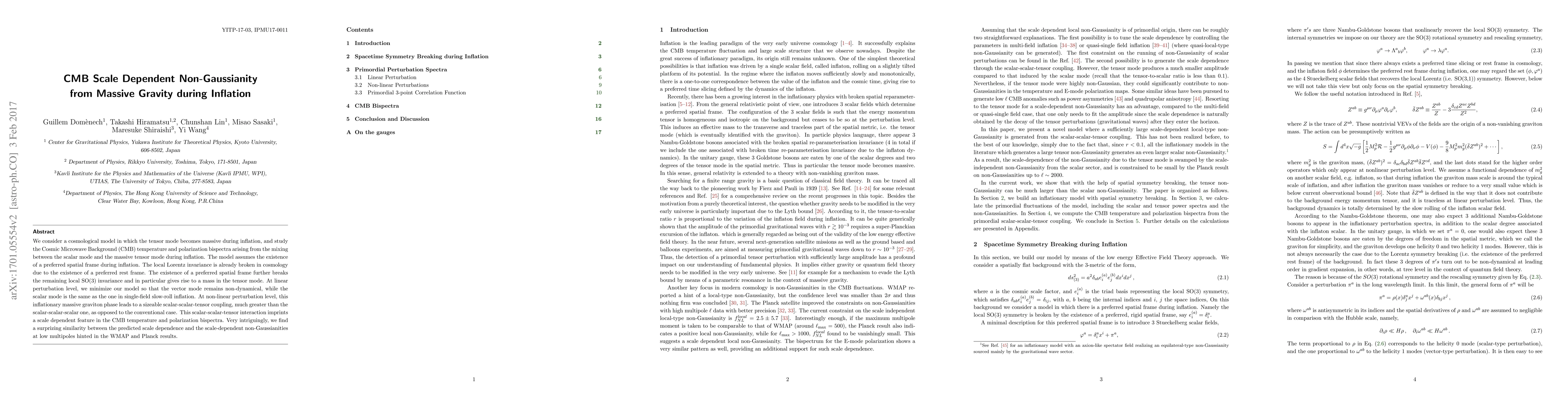 This paper investigates a cosmological model where tensor modes become massive during inflation, leading to scale-dependent non-Gaussianity in the CMB bispectra. The model predicts a significant scalar-scalar-tensor coupling, resulting in a surprising similarity to observed scale-dependent non-Gaussianities in CMB data from WMAP and Planck.