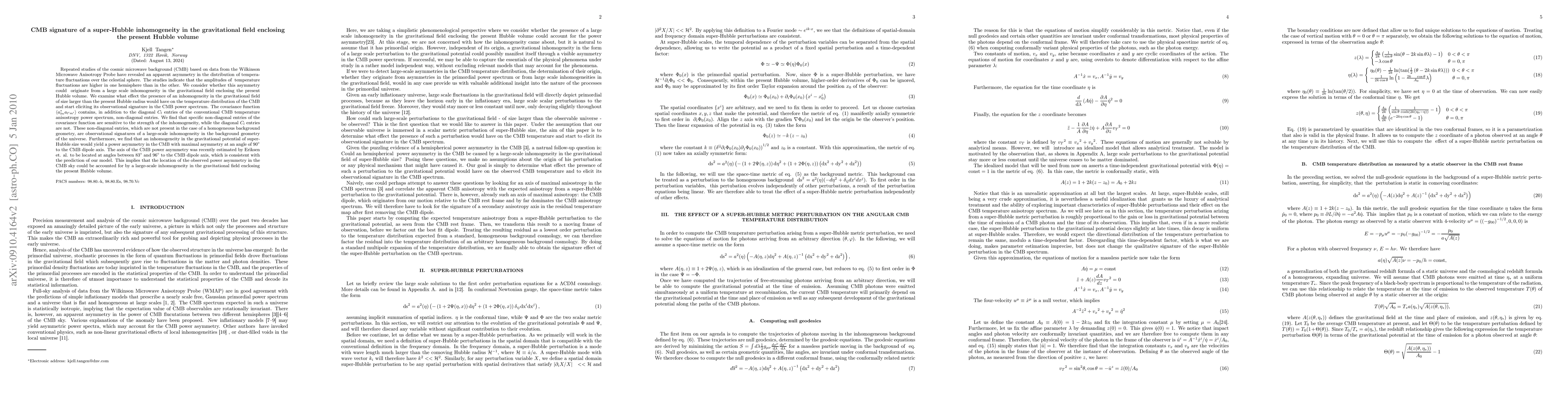 Repeated studies of the CMB based on WMAP data have revealed an apparent asymmetry in the distribution of temperature fluctuations over the celestial sphere. The studies indicate that the amplitudes of temperature fluctuations are higher in one hemisphere than in the other. We consider whether this asymmetry could originate from a large scale inhomogeneity in the gravitational field enclosing the present Hubble volume. We examine what effect the presence of an inhomogeneity in the gravitational field of size larger than the present Hubble radius would have on the temperature distribution of the CMB and start eliciting its observational signature in the CMB power spectrum. The covariance function contains, in addition to the diagonal entries of the conventional CMB temperature anisostropy power spectrum, non-diagonal entries. We find that specific non-diagonal entries of the covariance function are sensitive to the strength of the inhomogeneity, while the diagonal entries are not. These non-diagonal entries, which are not present in the case of a homogeneous background geometry, are observational signatures of a large-scale inhomogeneity in the background geometry of the universe. Furthermore, we find that an inhomogeneity in the gravitational potential of super-Hubble size would yield a power asymmetry in the CMB with maximal asymmetry at an angle of 90 degrees to the CMB dipole axis. The axis of the CMB power asymmetry was recently estimated by Eriksen et. al. to be located at angles between 83 and 96 degrees to the CMB dipole axis, which is consistent with the prediction of our model. This implies that the location of the observed power asymmetry in the CMB sky could be accounted for by a large-scale inhomogeneity in the gravitational field enclosing the present Hubble volume.