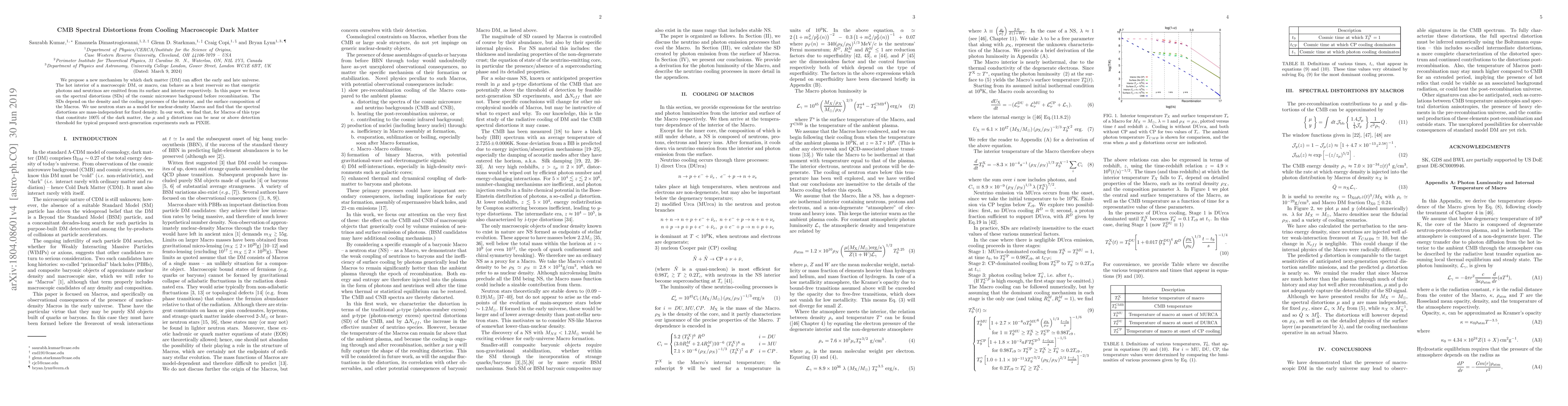 This paper explores how macroscopic dark matter (DM) objects, modeled as neutron stars, can emit energetic photons from their hot interiors, causing spectral distortions in the cosmic microwave background (CMB). These distortions, dependent on DM density and cooling processes, could be detectable by next-generation CMB experiments like PIXIE.