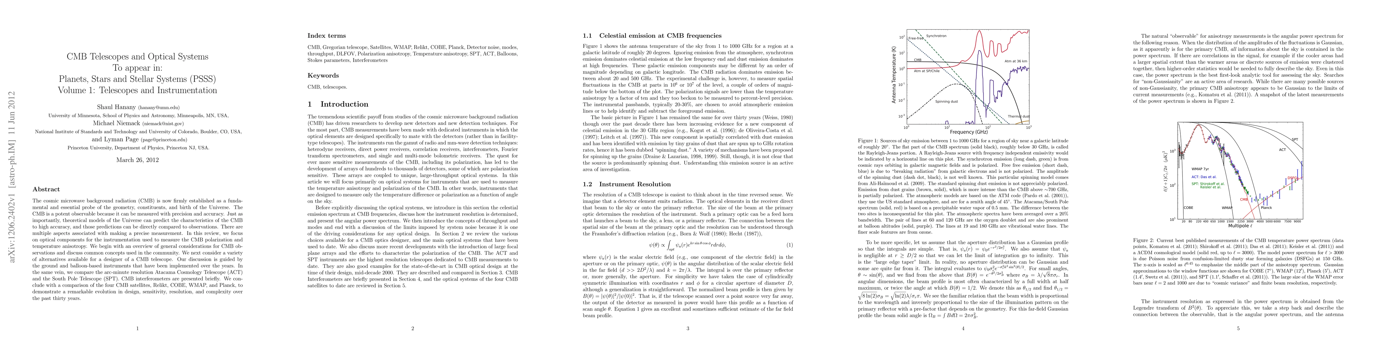 This review focuses on optical systems for cosmic microwave background (CMB) telescopes, discussing design alternatives and comparing ground, balloon, and satellite-based instruments like ACT, SPT, and Relikt to Planck. It highlights advancements in sensitivity, resolution, and complexity over three decades.