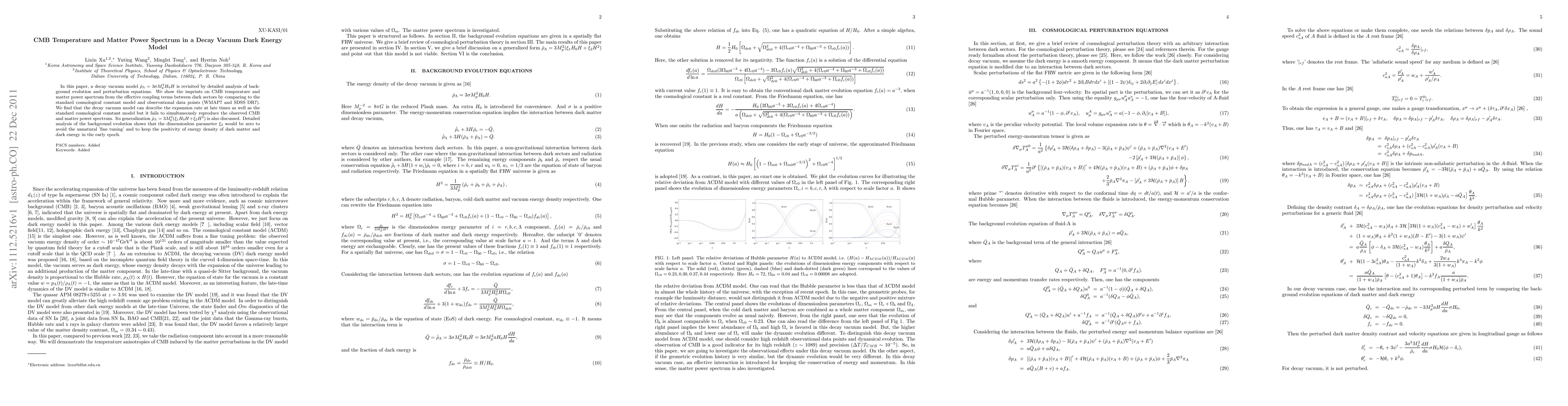 This paper analyzes a decay vacuum dark energy model and its effects on the CMB temperature and matter power spectrum, finding it can match the expansion rate but not the observed CMB and matter power spectrum. It also discusses a generalized model, concluding that certain parameters must be zero to avoid fine-tuning and maintain energy density positivity.