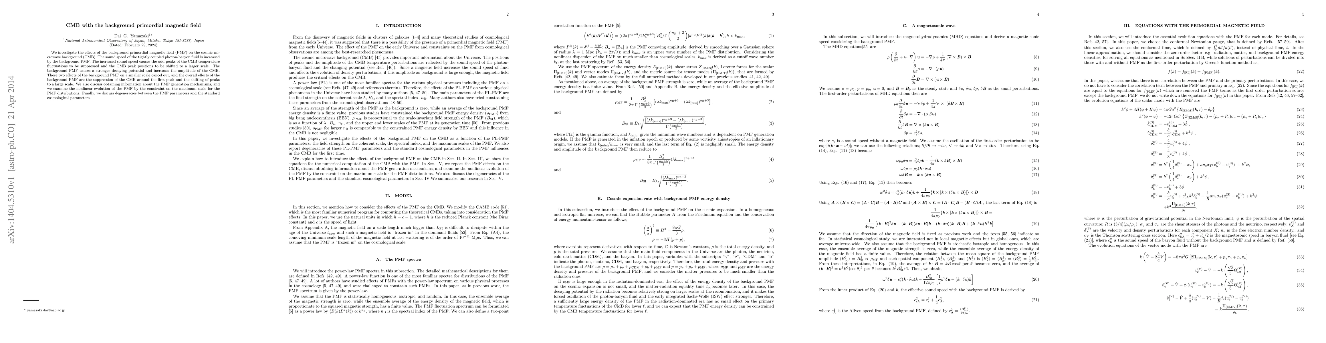 This paper examines how a background primordial magnetic field (PMF) influences the cosmic microwave background (CMB), finding that it suppresses odd peaks and shifts peak positions to larger scales. The study also explores the implications for understanding PMF generation mechanisms and discusses potential degeneracies with standard cosmological parameters.