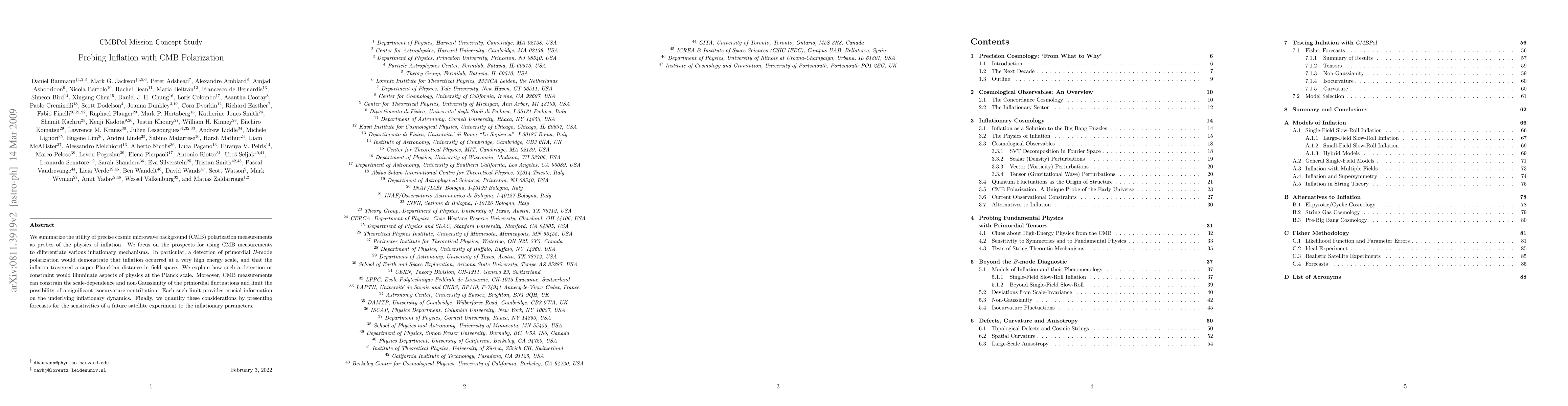 We summarize the utility of precise cosmic microwave background (CMB) polarization measurements as probes of the physics of inflation. We focus on the prospects for using CMB measurements to differentiate various inflationary mechanisms. In particular, a detection of primordial B-mode polarization would demonstrate that inflation occurred at a very high energy scale, and that the inflaton traversed a super-Planckian distance in field space. We explain how such a detection or constraint would illuminate aspects of physics at the Planck scale. Moreover, CMB measurements can constrain the scale-dependence and non-Gaussianity of the primordial fluctuations and limit the possibility of a significant isocurvature contribution. Each such limit provides crucial information on the underlying inflationary dynamics. Finally, we quantify these considerations by presenting forecasts for the sensitivities of a future satellite experiment to the inflationary parameters.
