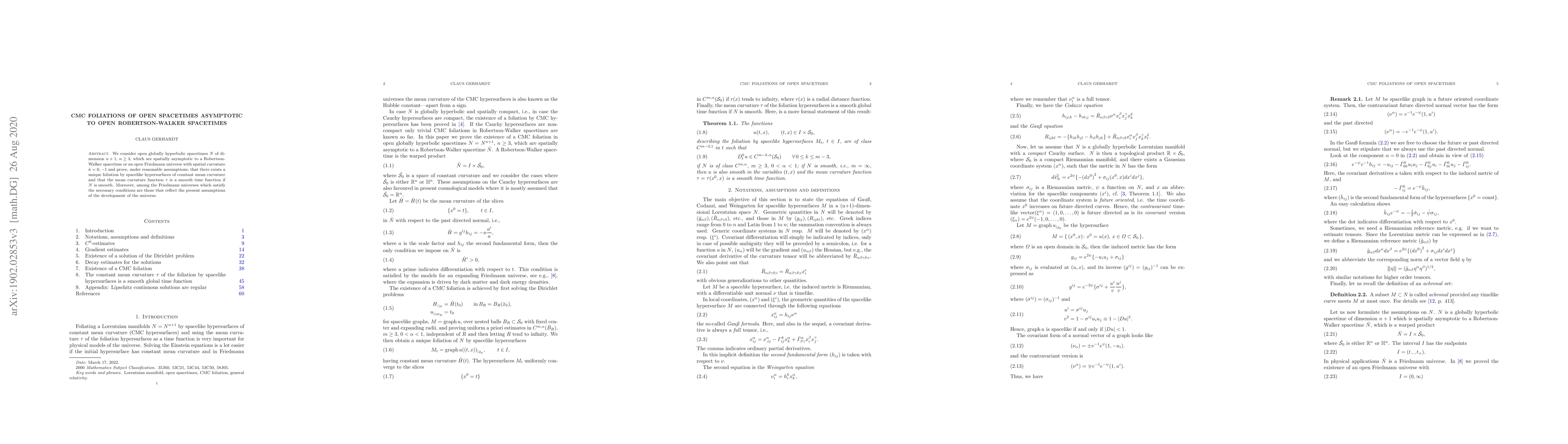 We consider open globally hyperbolic spacetimes $N$ of dimension $n+1$, $n\ge 3$, which are spatially asymptotic to a Robertson-Walker spacetime or an open Friedmann universe with spatial curvature $\tilde\kappa = 0,-1$ and prove, under reasonable assumptions, that there exists a unique foliation by hypersurfaces of constant mean curvature and that the mean curvature function $\tau$ is a smooth time function if $N$ is smooth. Moreover, among the Friedmann universes which satisfy the necessary conditions are those that reflect the present assumptions of the development of the universe.