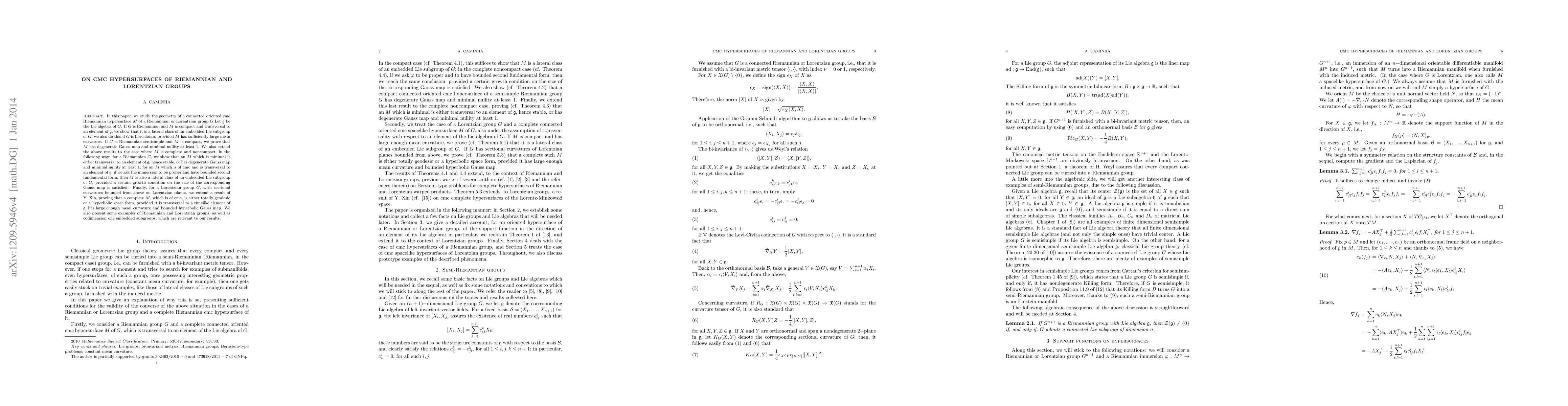 This research explores the geometry of constant mean curvature (cmc) hypersurfaces in semi-Riemannian groups. It establishes conditions under which such hypersurfaces are lateral classes of closed embedded Lie subgroups, particularly when the group is Riemannian or Lorentzian. The study also examines minimal hypersurfaces in Riemannian semisimple groups, proving they have degenerate Gauss maps and specific nullity. For Lorentzian groups with bounded curvature, it extends a result by Y. Xin, showing that complete cmc hypersurfaces transversal to timelike elements are totally umbilical under certain conditions.
