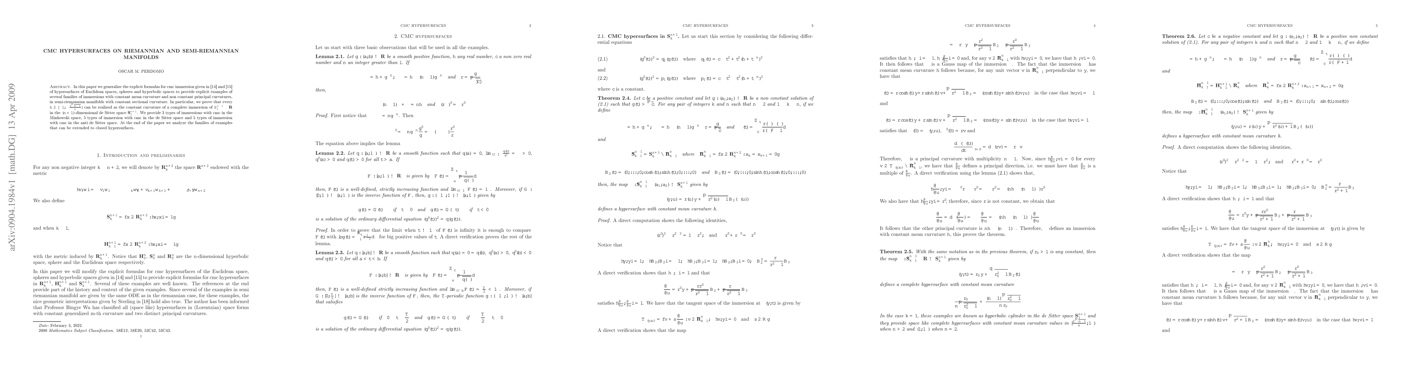 In this paper we show explicit examples of several families of immersions with constant mean curvature and non constant principal curvatures, in semi-riemannian manifolds with constant sectional curvature. In particular, we prove that every h in [-1,-2 sqrt{n-1}/n) can be realized as the constant curvature of a complete immersion of S_1^{n-1} x R in the (n+1)-dimensional de Sitter space S_1^{n+1}. We provide 3 types of immersions with cmc in the Minkowski space, 5 types of immersion with cmc in the de Sitter space and 5 types of immersion with cmc in the anti de Sitter space. At the end of the paper we analyze the families of examples that can be extended to closed hypersurfaces.