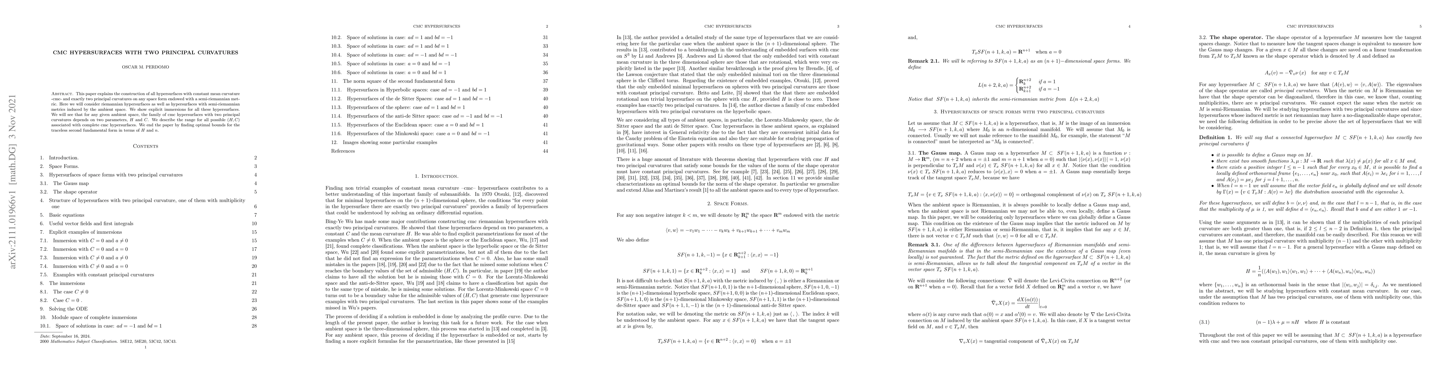 This paper explains the construction of all hypersurfaces with constant mean curvature -- cmc -- and exactly two principal curvatures on any space form endowed with a semi-riemannian metric. Here we will consider riemannian hypersurfaces as well as hypersurfaces with semi-riemannian metrics induced by the ambient space. We show explicit immersions for all these hypersurfaces. We will see that for any given ambient space, the family of cmc hypersurfaces with two principal curvatures depends on two parameters, $H$ and $C$. We describe the range for all possible $(H,C)$ associated with complete cmc hypersurfaces. We end the paper by finding optimal bounds for the traceless second fundamental form in terms of $H$ and $n$.