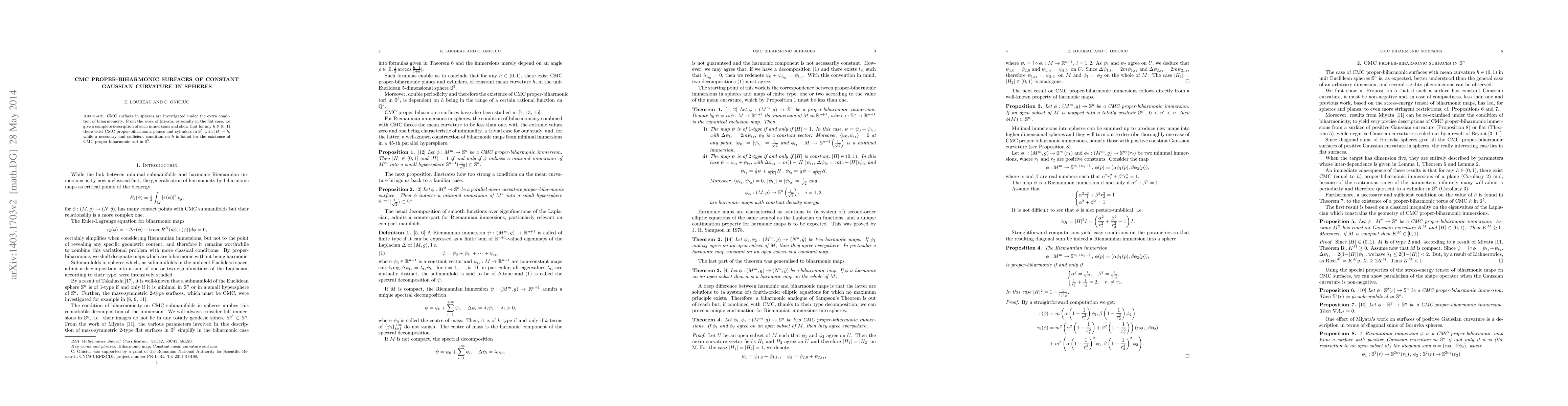 This paper investigates CMC surfaces in spheres that are also biharmonic, providing a complete description of such immersions. It demonstrates the existence of CMC proper-biharmonic planes and cylinders in $\sn^5$ for any $h\in (0,1)$, and identifies a necessary and sufficient condition for the existence of CMC proper-biharmonic tori in $\sn^5$.