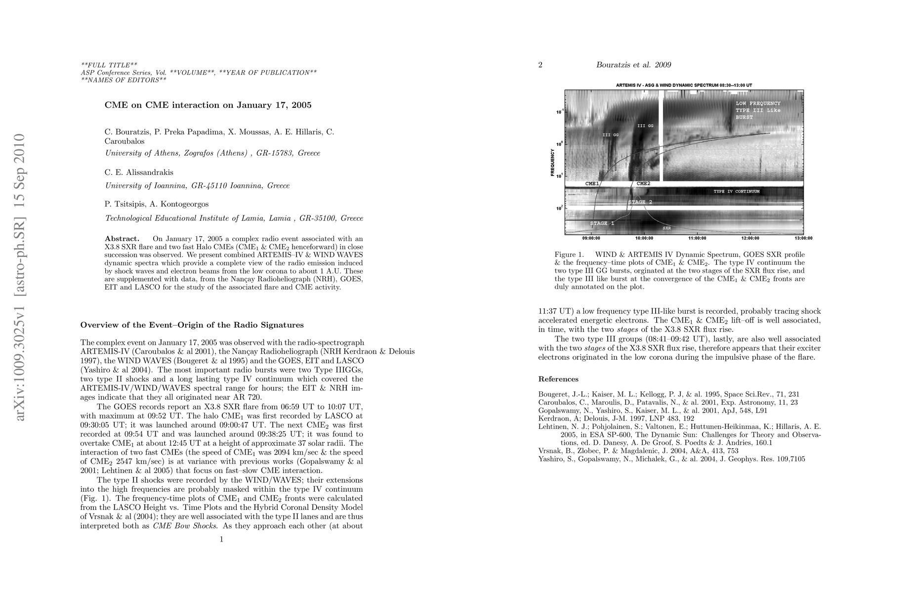 This research examines a significant solar event on January 17, 2005, involving an X3.8 solar flare and two fast Halo Coronal Mass Ejections (CMEs). Using ARTEMIS-IV & WIND WAVES dynamic spectra, combined with data from Nançay Radioheliograph, GOES, EIT, and LASCO, the study details the radio emission caused by shock waves and electron beams from the low corona to about 1 A.U.