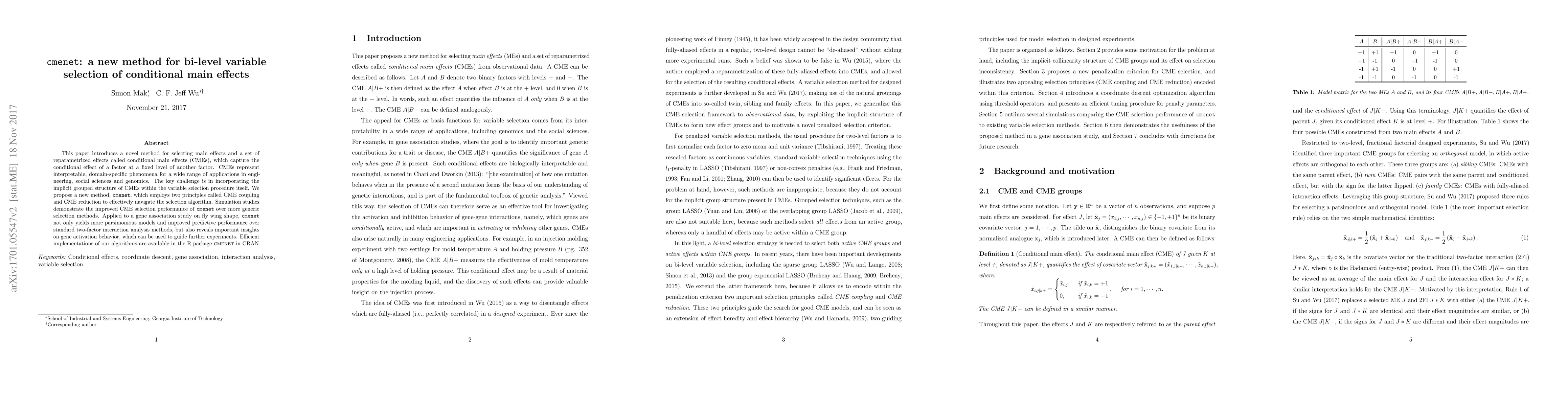 This paper introduces a novel method for selecting main effects and a set of reparametrized effects called conditional main effects (CMEs), which capture the conditional effect of a factor at a fixed level of another factor. CMEs represent interpretable, domain-specific phenomena for a wide range of applications in engineering, social sciences and genomics. The key challenge is in incorporating the implicit grouped structure of CMEs within the variable selection procedure itself. We propose a new method, cmenet, which employs two principles called CME coupling and CME reduction to effectively navigate the selection algorithm. Simulation studies demonstrate the improved CME selection performance of cmenet over more generic selection methods. Applied to a gene association study on fly wing shape, cmenet not only yields more parsimonious models and improved predictive performance over standard two-factor interaction analysis methods, but also reveals important insights on gene activation behavior, which can be used to guide further experiments. Efficient implementations of our algorithms are available in the R package cmenet in CRAN.