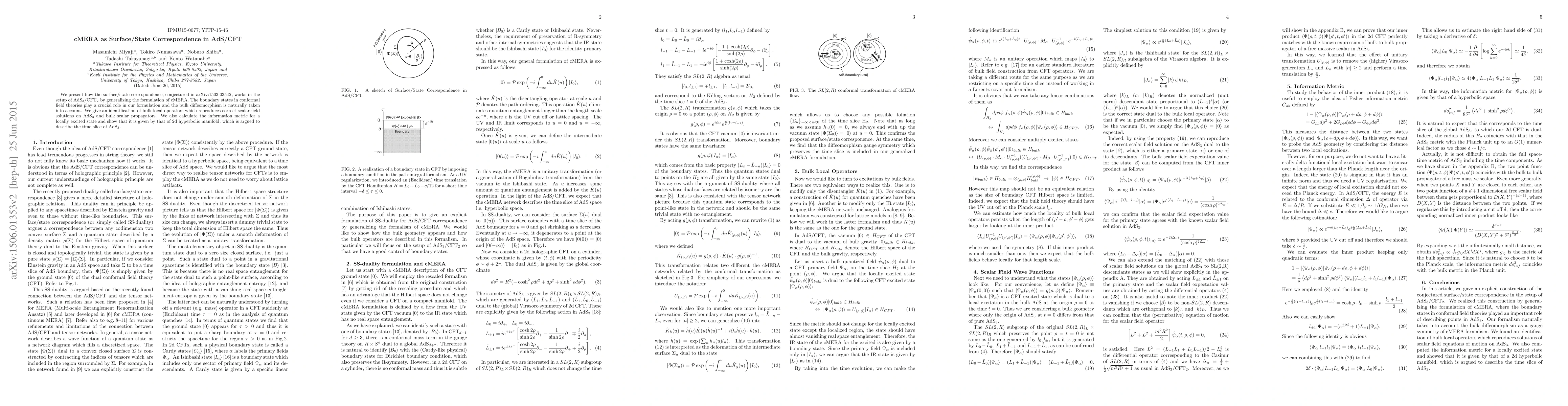 We present how the surface/state correspondence, conjectured in arXiv:1503.03542, works in the setup of AdS3/CFT2 by generalizing the formulation of cMERA. The boundary states in conformal field theories play a crucial role in our formulation and the bulk diffeomorphism is naturally taken into account. We give an identification of bulk local operators which reproduces correct scalar field solutions on AdS3 and bulk scalar propagators. We also calculate the information metric for a locally excited state and show that it is given by that of 2d hyperbolic manifold, which is argued to describe the time slice of AdS3.
