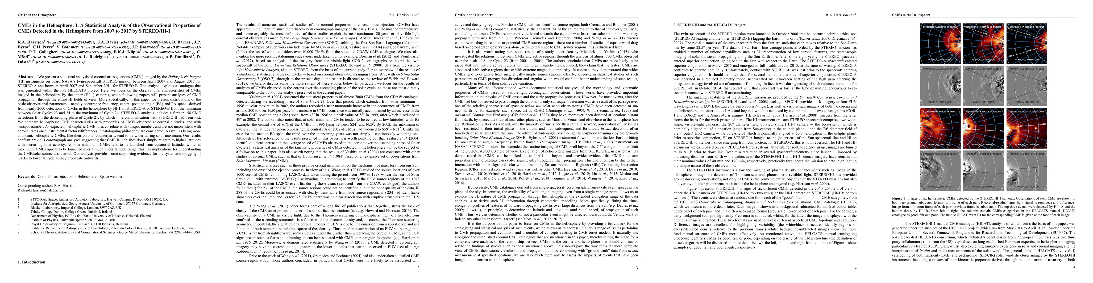 We present a statistical analysis of coronal mass ejections (CMEs) imaged by the Heliospheric Imager (HI) instruments aboard NASAs twin-spacecraft STEREO mission between April 2007 and August 2017 for STEREO-A and between April 2007 and September 2014 for STEREO-B. The analysis exploits a catalogue that was generated within the FP7 HELCATS project. Here, we focus on the observational characteristics of CMEs imaged in the heliosphere by the inner (HI-1) cameras. More specifically, in this paper we present distributions of the basic observational parameters - namely occurrence frequency, central position angle (PA) and PA span - derived from nearly 2000 detections of CMEs in the heliosphere by HI-1 on STEREO-A or STEREO-B from the minimum between Solar Cycles 23 and 24 to the maximum of Cycle 24; STEREO-A analysis includes a further 158 CME detections from the descending phase of Cycle 24, by which time communication with STEREO-B had been lost. We compare heliospheric CME characteristics with properties of CMEs observed at coronal altitudes, and with sunspot number. As expected, heliospheric CME rates correlate with sunspot number, and are not inconsistent with coronal rates once instrumental factors/differences in cataloguing philosophy are considered. As well as being more abundant, heliospheric CMEs, like their coronal counterparts, tend to be wider during solar maximum. Our results confirm previous coronagraph analyses suggesting that CME launch sites don't simply migrate to higher latitudes with increasing solar activity. At solar minimum, CMEs tend to be launched from equatorial latitudes while, at maximum, CMEs appear to be launched over a much wider latitude range; this has implications for understanding the CME/solar source association. Our analysis provides some supporting evidence for the systematic dragging of CMEs to lower latitude as they propagate outwards.