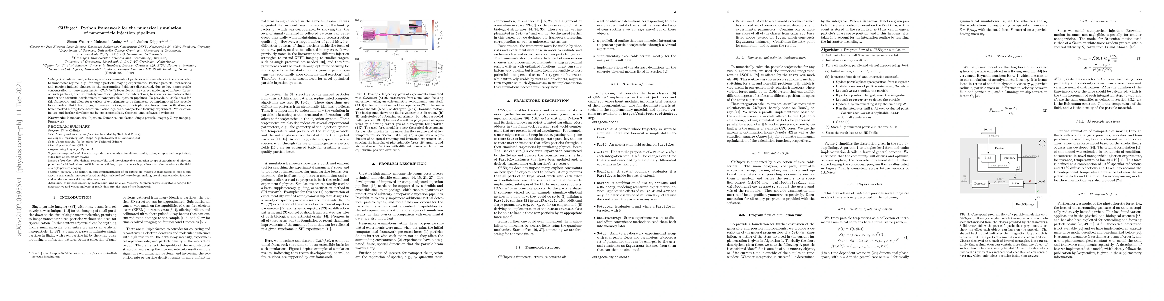 CMInject is a Python framework for simulating nanoparticle injection experiments, focusing on modeling fluid-dynamics and light-induced forces. It includes models for fluid drag, Brownian motion, and photophoretic forces, and was benchmarked against a nanoparticle focusing experiment.