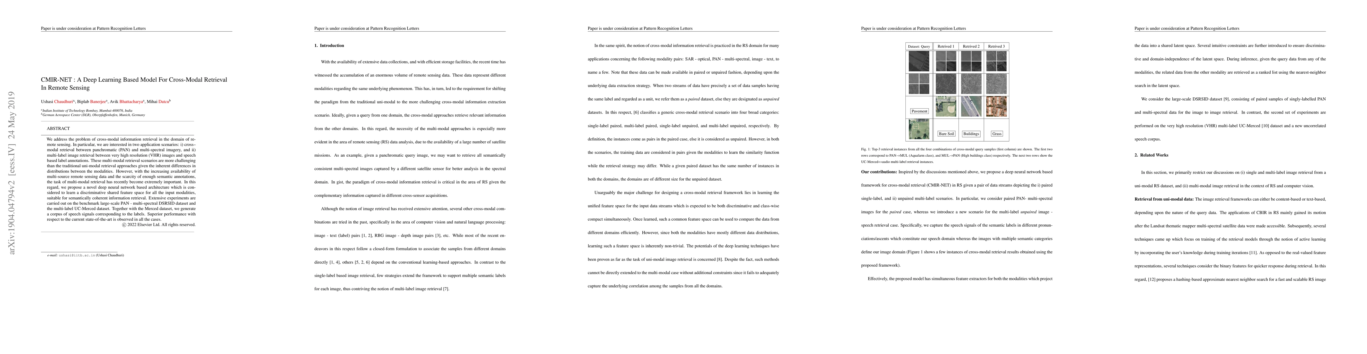 The paper proposes CMIR-NET, a deep learning model for cross-modal retrieval in remote sensing, addressing retrieval between panchromatic and multi-spectral images, and multi-label retrieval of very high resolution images with speech-based annotations. The model learns a shared feature space for semantically coherent information retrieval, achieving superior performance on benchmark datasets.
