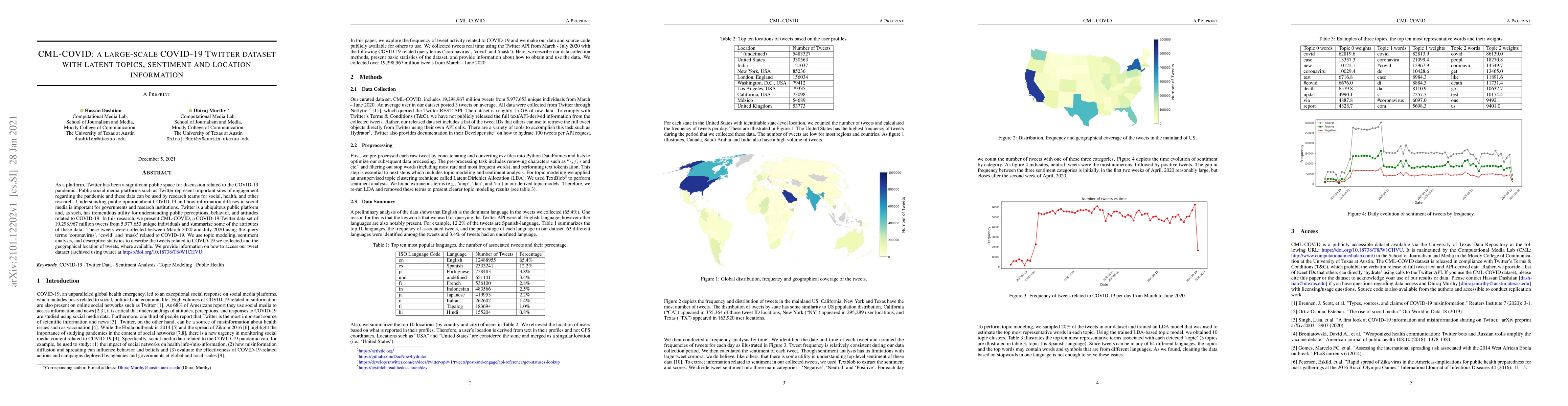 CML-COVID is a comprehensive dataset of 19 million COVID-19 related tweets collected from March to July 2020, featuring topic modeling, sentiment analysis, and geolocation data to study public perception and information diffusion during the pandemic. The dataset is available for research on social, health, and behavioral impacts of COVID-19.