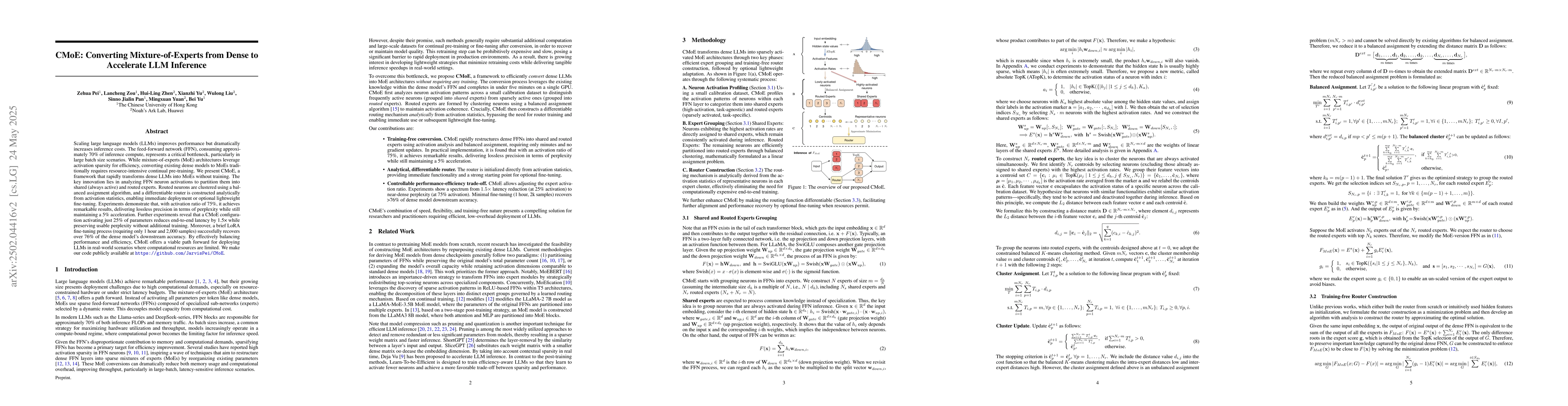 The research introduces CMoE, a framework that rapidly transforms dense LLMs into MoEs without training by analyzing FFN neuron activations and partitioning them into shared and routed experts using a differentiable router constructed from activation statistics.