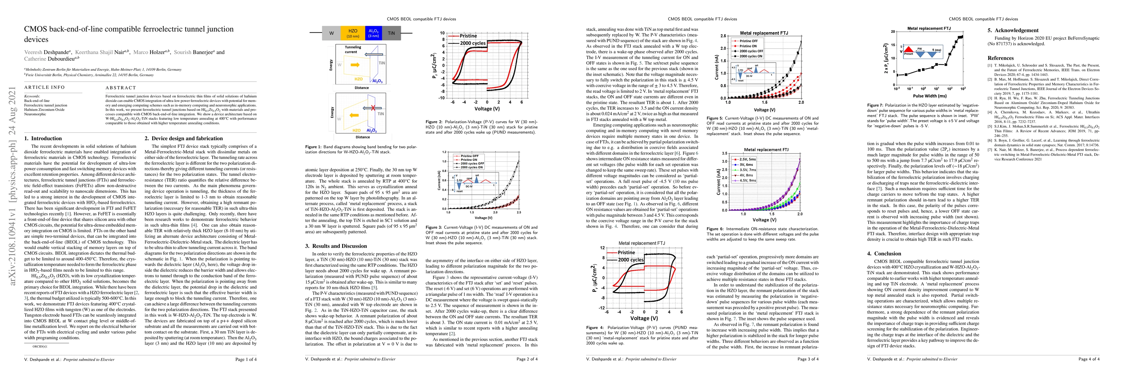 Ferroelectric tunnel junction devices based on ferroelectric thin films of solid solutions of hafnium dioxide can enable CMOS integration of ultra-low power ferroelectric devices with potential for memory and emerging computing schemes such as in-memory computing and neuromorphic applications. In this work, we present ferroelectric tunnel junctions based on Hf$_{0.5}$Zr$_{0.5}$O$_{2}$ with materials and processes compatible with CMOS back-end-of-line integration. We show a device architecture based on W-Hf$_{0.5}$Zr$_{0.5}$O$_{2}$-Al$_{2}$O$_{3}$-TiN stacks featuring low temperature annealing at 400{\deg}C with performance comparable to those obtained with higher temperature annealing conditions.