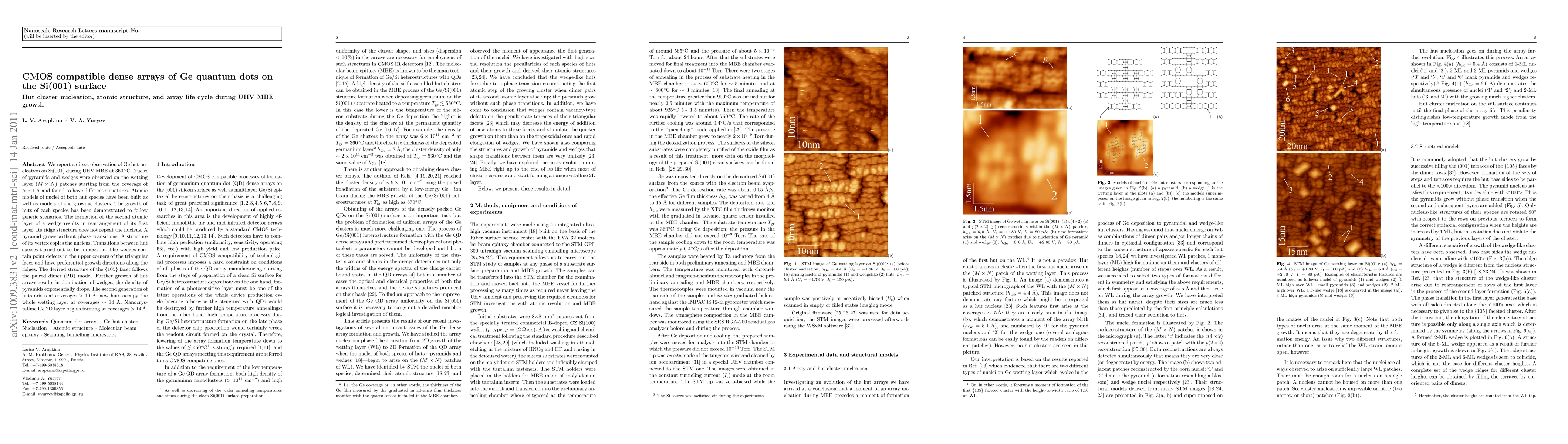 This paper investigates the nucleation and growth of Ge quantum dot huts on Si(001) using UHV MBE and STM. It reveals distinct atomic structures for pyramid and wedge huts, with the latter exhibiting point defects and preferential growth directions, while the former grows without phase transitions.