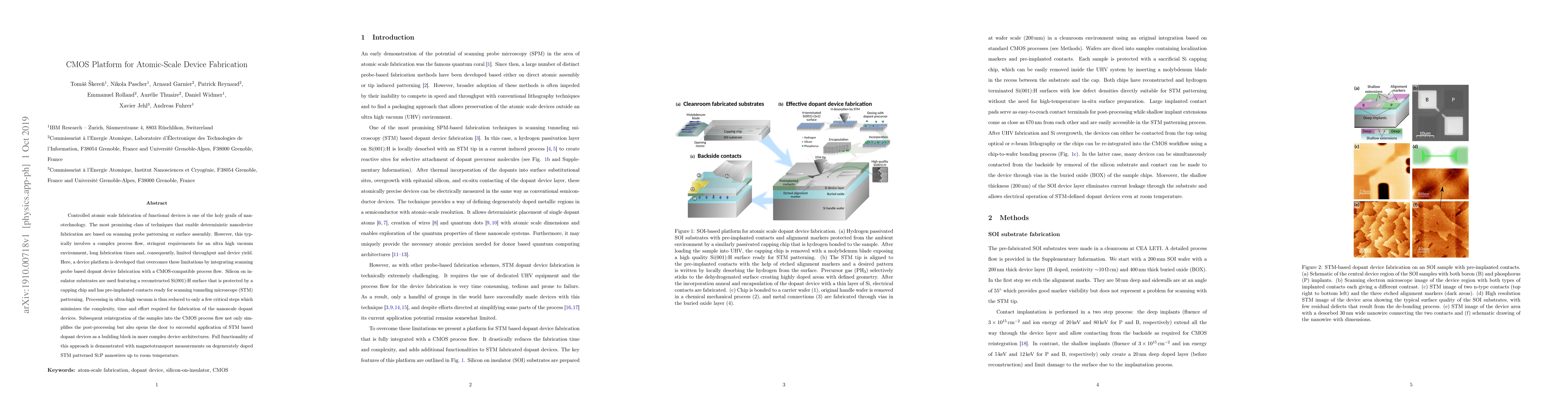 The research presents a CMOS platform for atomic-scale device fabrication, integrating scanning probe-based dopant device fabrication with a CMOS-compatible process flow. Silicon on insulator substrates are used with pre-implanted contacts and a reconstructed Si(001):H surface, protected by a capping chip, minimizing the complexity and time required for nanoscale dopant devices fabrication.