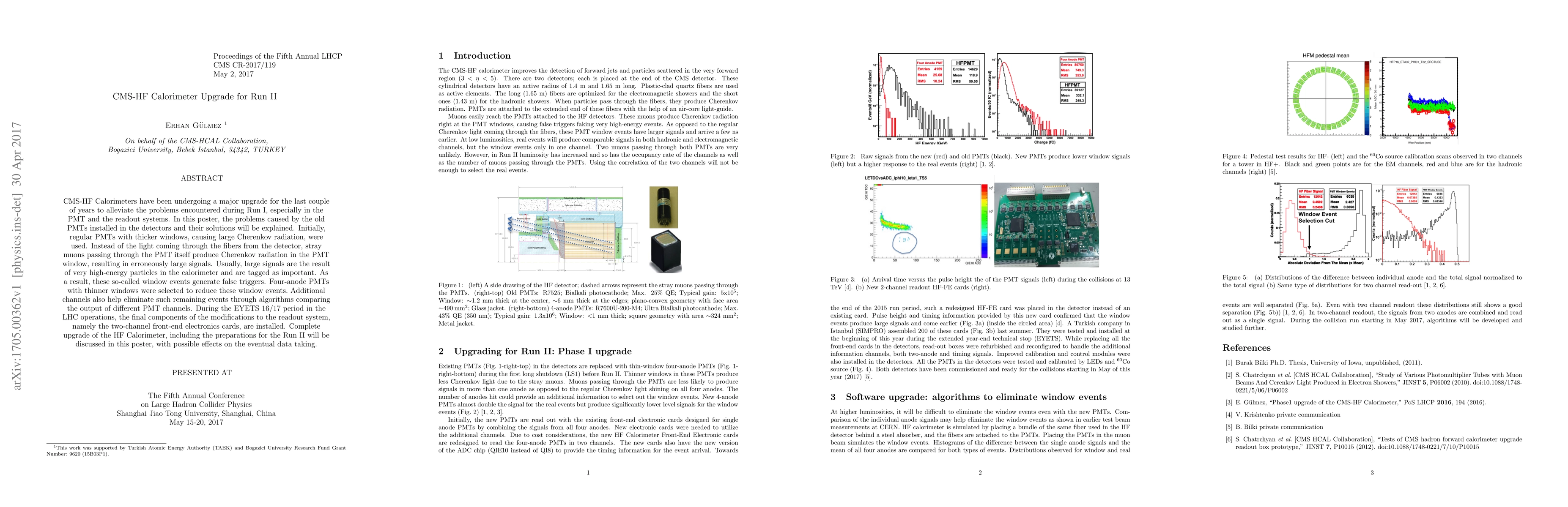 CMS-HF Calorimeters have been undergoing a major upgrade for the last couple of years to alleviate the problems encountered during Run I, especially in the PMT and the readout systems. In this poster, the problems caused by the old PMTs installed in the detectors and their solutions will be explained. Initially, regular PMTs with thicker windows, causing large Cherenkov radiation, were used. Instead of the light coming through the fibers from the detector, stray muons passing through the PMT itself produce Cherenkov radiation in the PMT window, resulting in erroneously large signals. Usually, large signals are the result of very high-energy particles in the calorimeter and are tagged as important. As a result, these so-called window events generate false triggers. Four-anode PMTs with thinner windows were selected to reduce these window events. Additional channels also help eliminate such remaining events through algorithms comparing the output of different PMT channels. During the EYETS 16/17 period in the LHC operations, the final components of the modifications to the readout system, namely the two-channel front-end electronics cards, are installed. Complete upgrade of the HF Calorimeter, including the preparations for the Run II will be discussed in this poster, with possible effects on the eventual data taking.