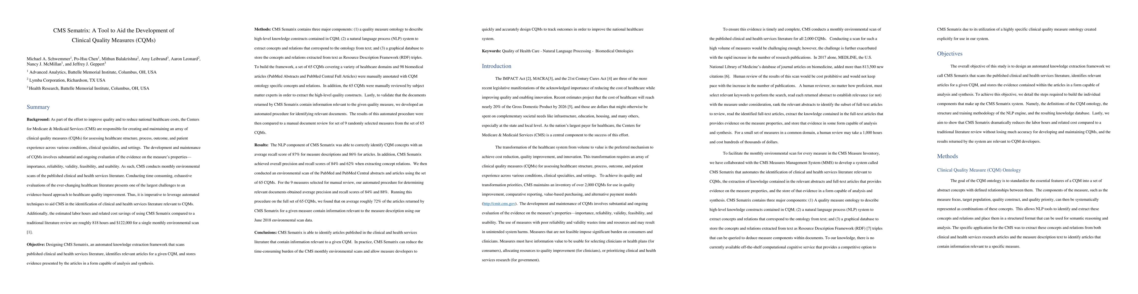 As part of the effort to improve quality and to reduce national healthcare costs, the Centers for Medicare and Medicaid Services (CMS) are responsible for creating and maintaining an array of clinical quality measures (CQMs) for assessing healthcare structure, process, outcome, and patient experience across various conditions, clinical specialties, and settings. The development and maintenance of CQMs involves substantial and ongoing evaluation of the evidence on the measure's properties: importance, reliability, validity, feasibility, and usability. As such, CMS conducts monthly environmental scans of the published clinical and health service literature. Conducting time consuming, exhaustive evaluations of the ever-changing healthcare literature presents one of the largest challenges to an evidence-based approach to healthcare quality improvement. Thus, it is imperative to leverage automated techniques to aid CMS in the identification of clinical and health services literature relevant to CQMs. Additionally, the estimated labor hours and related cost savings of using CMS Sematrix compared to a traditional literature review are roughly 818 hours and 122,000 dollars for a single monthly environmental scan.