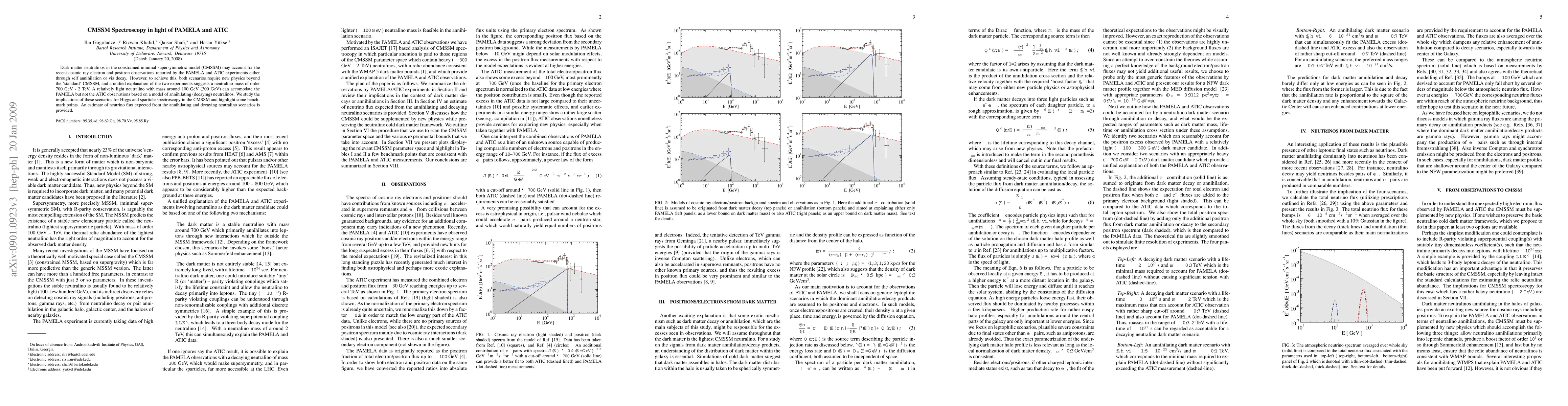 Dark matter neutralinos in the constrained minimal supersymmetric model (CMSSM) may account for the recent cosmic ray electron and positron observations reported by the PAMELA and ATIC experiments either through self annihilation or via decay. However, to achieve this, both scenarios require new physics beyond the 'standard' CMSSM, and a unified explanation of the two experiments suggests a neutralino mass of order 700 GeV - 2 TeV. A relatively light neutralino with mass around 100 GeV (300 GeV) can accomodate the PAMELA but not the ATIC observations based on a model of annihilating (decaying) neutralinos. We study the implications of these scenarios for Higgs and sparticle spectroscopy in the CMSSM and highlight some benchmark points. An estimate of neutrino flux expected from the annihilating and decaying neutralino scenarios is provided.