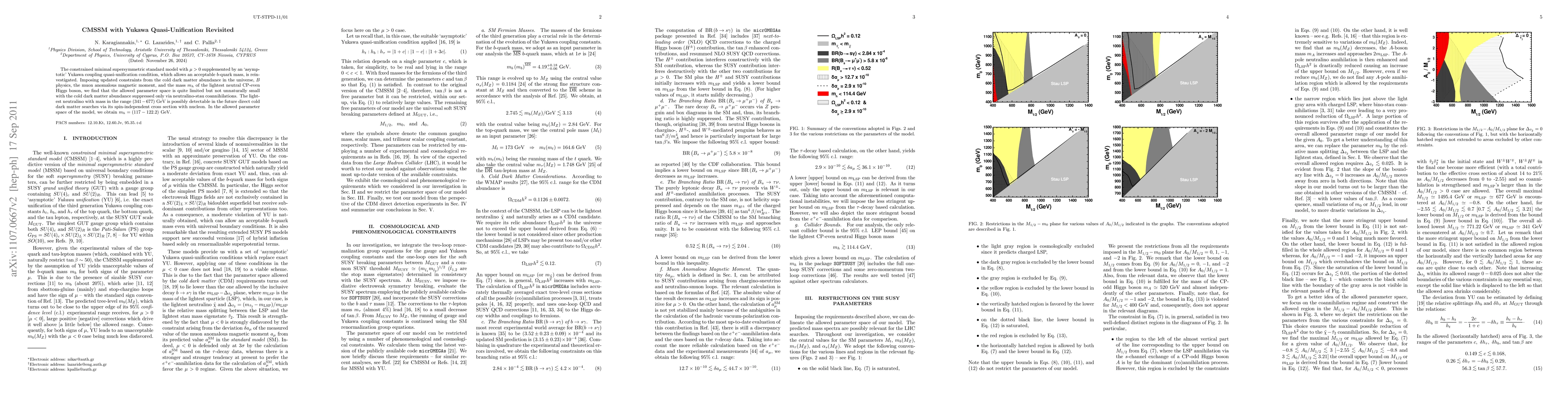 The constrained minimal supersymmetric standard model with mu>0 supplemented by an `asymptotic' Yukawa coupling quasi-unification condition, which allows an acceptable b-quark mass, is reinvestigated. Imposing updated constraints from the cold dark matter abundance in the universe, B physics, the muon anomalous magnetic moment, and the mass mh of the lightest neutral CP-even Higgs boson, we find that the allowed parameter space is quite limited but not unnaturally small with the cold dark matter abundance suppressed only via neutralino-stau coannihilations. The lightest neutralino with mass in the range (341-677) GeV is possibly detectable in the future direct cold dark matter searches via its spin-independent cross section with nucleon. In the allowed parameter space of the model, we obtain mh=(117-122.2) GeV.