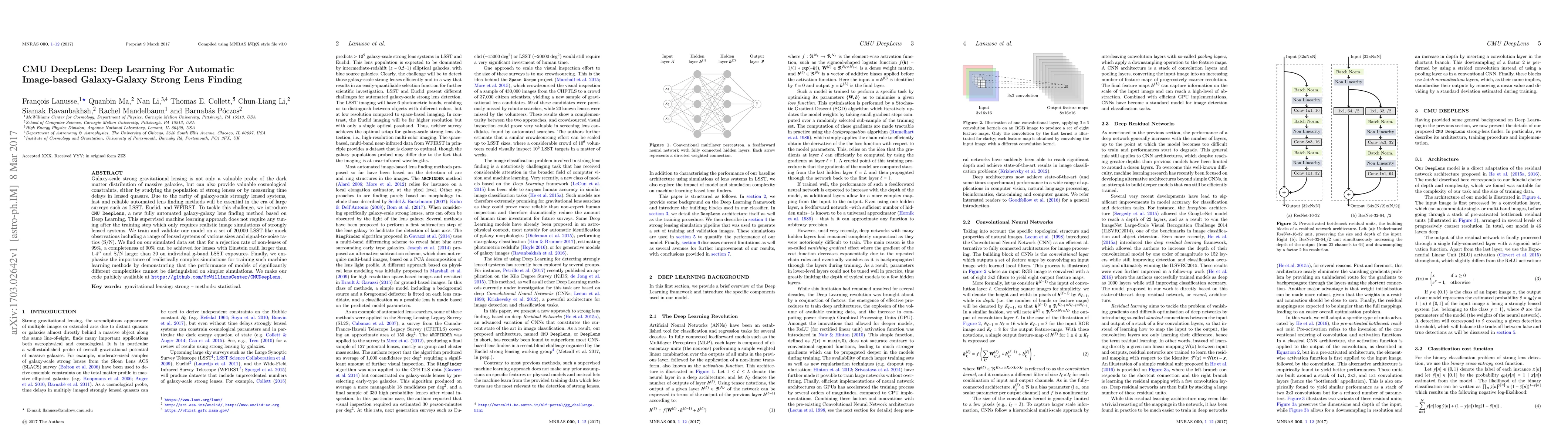 CMU DeepLens uses Deep Learning for automated galaxy-galaxy lens finding, achieving high completeness and low rejection rates on simulated LSST data. The method is robust and does not require tuning post-training, emphasizing the necessity of complex simulations for effective machine learning training.