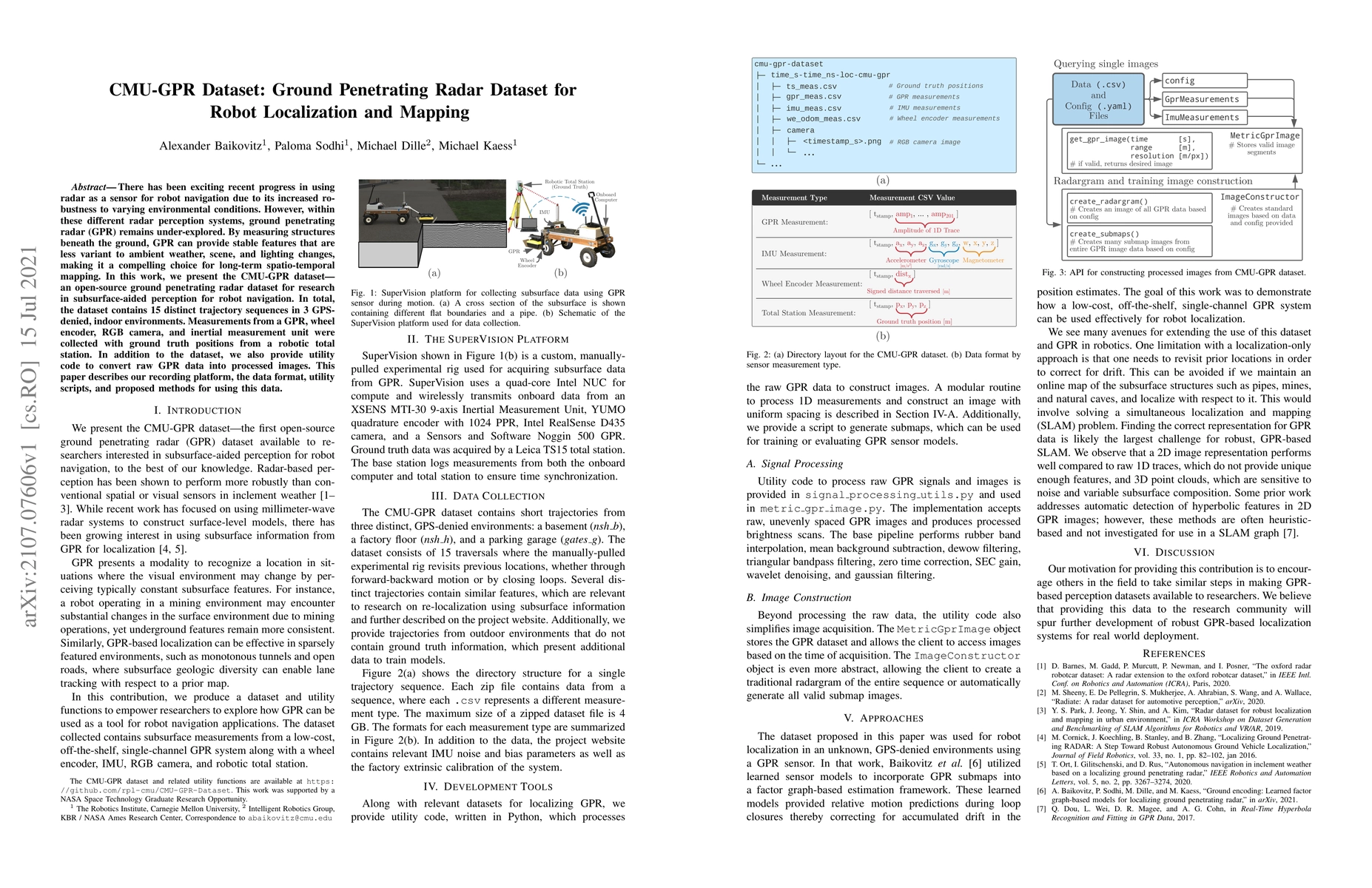 This paper introduces the CMU-GPR dataset, an open-source collection of ground penetrating radar data for robot localization and mapping, with 15 sequences from indoor GPS-denied environments. The dataset includes GPR, wheel encoder, RGB camera, and IMU data, along with utility code for processing GPR data and methods for its use in research.