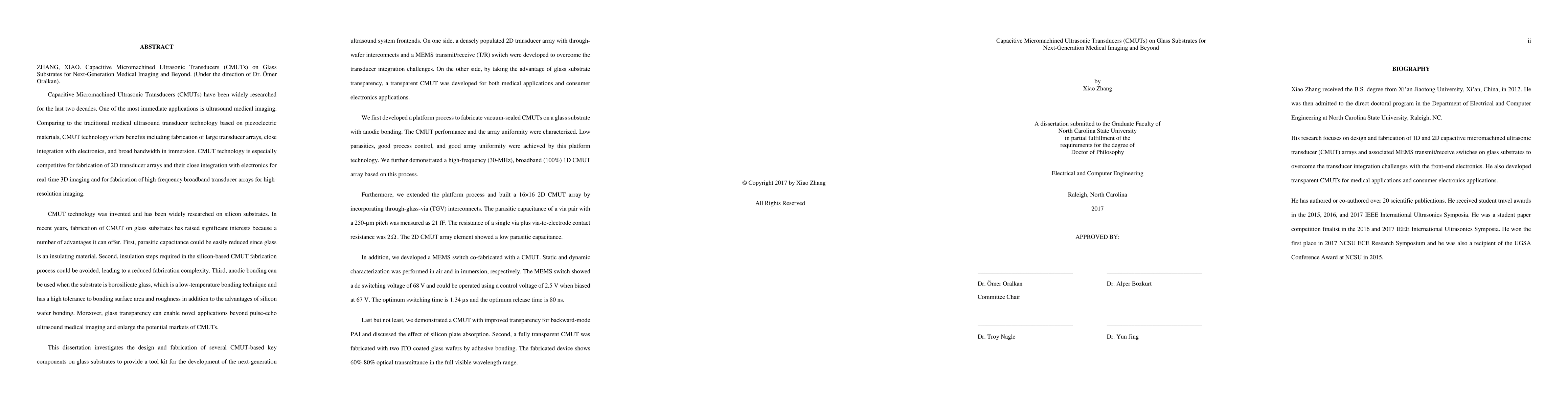 CMUT technology was invented and has been widely researched on silicon substrates. In recent years, fabrication of CMUT on glass substrates has raised significant interests because a number of advantages it can offer. First, parasitic capacitance could be easily reduced since glass is an insulating material. Second, insulation steps required in the silicon-based CMUT fabrication process could be avoided, leading to a reduced fabrication complexity. Third, anodic bonding can be used when the substrate is borosilicate glass, which is a low-temperature bonding technique and has a high tolerance to bonding surface area and roughness in addition to the advantages of silicon wafer bonding. Moreover, glass transparency can enable novel applications beyond pulse-echo ultrasound medical imaging and enlarge the potential markets of CMUTs.