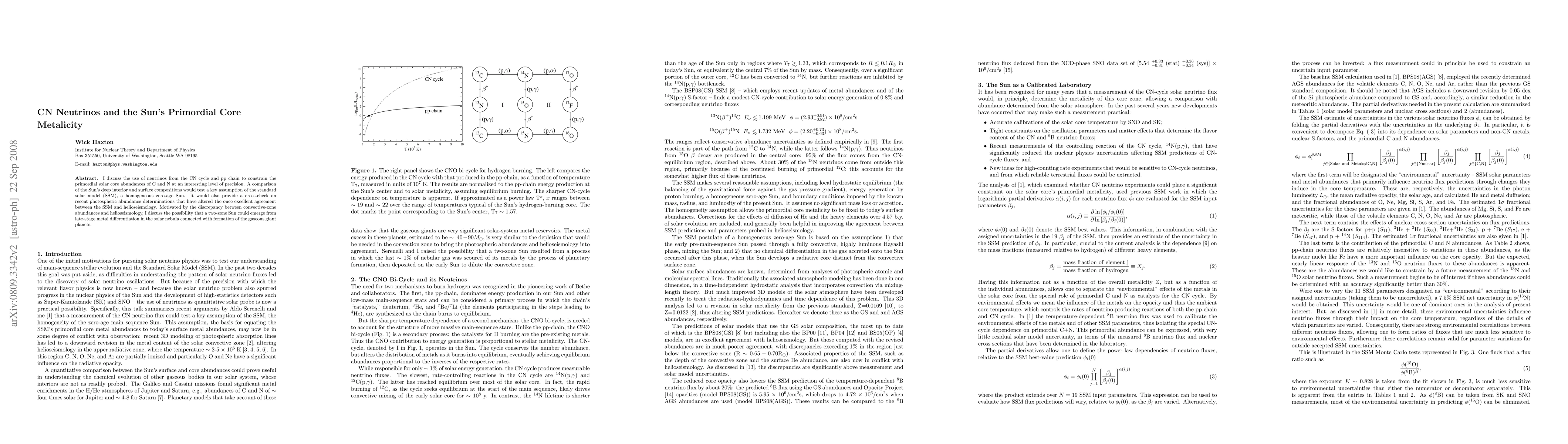 I discuss the use of neutrinos from the CN cycle and pp chain to constrain the primordial solar core abundances of C and N at an interesting level of precision. A comparison of the Sun's deep interior and surface compositions would test a key assumption of the standard solar model (SSM), a homogeneous zero-age Sun. It would also provide a cross-check on recent photospheric abundance determinations that have altered the once excellent agreement between the SSM and helioseismology. Motivated by the discrepancy between convective-zone abundances and helioseismology, I discuss the possibility that a two-zone Sun could emerge from late-stage metal differentiation in the solar nebula connected with formation of the gaseous giant planets.