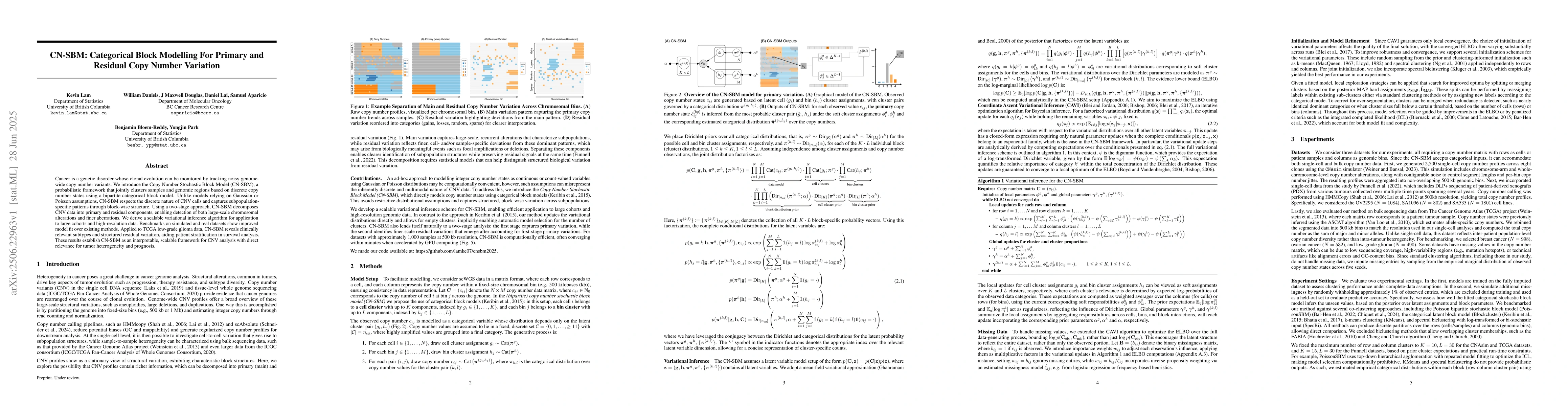 Cancer is a genetic disorder whose clonal evolution can be monitored by tracking noisy genome-wide copy number variants. We introduce the Copy Number Stochastic Block Model (CN-SBM), a probabilistic framework that jointly clusters samples and genomic regions based on discrete copy number states using a bipartite categorical block model. Unlike models relying on Gaussian or Poisson assumptions, CN-SBM respects the discrete nature of CNV calls and captures subpopulation-specific patterns through block-wise structure. Using a two-stage approach, CN-SBM decomposes CNV data into primary and residual components, enabling detection of both large-scale chromosomal alterations and finer aberrations. We derive a scalable variational inference algorithm for application to large cohorts and high-resolution data. Benchmarks on simulated and real datasets show improved model fit over existing methods. Applied to TCGA low-grade glioma data, CN-SBM reveals clinically relevant subtypes and structured residual variation, aiding patient stratification in survival analysis. These results establish CN-SBM as an interpretable, scalable framework for CNV analysis with direct relevance for tumor heterogeneity and prognosis.