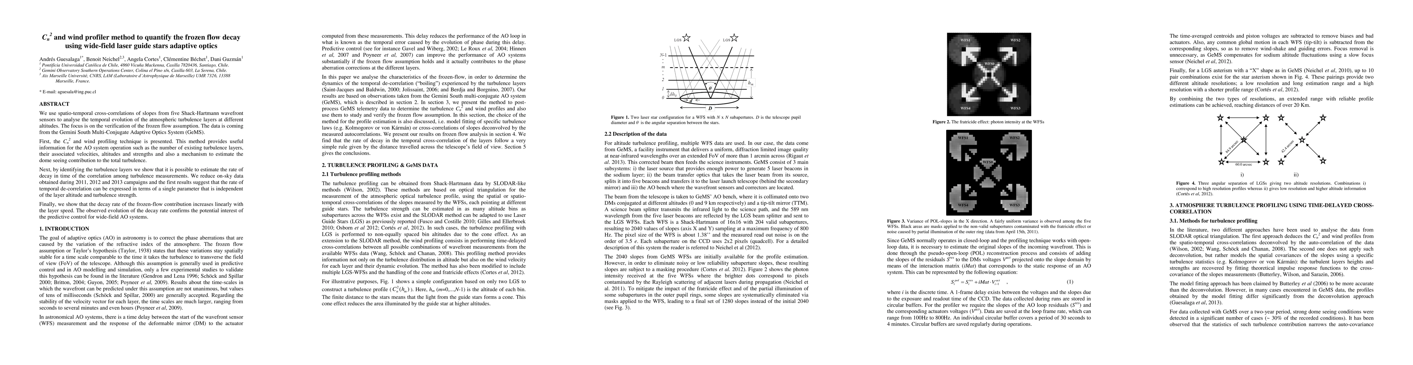 The paper introduces a method using spatio-temporal cross-correlations from five Shack-Hartmann wavefront sensors to analyze atmospheric turbulence layers' evolution. It validates the frozen flow assumption, identifies turbulence layers, and estimates their decay rate using Gemini South Multi-Conjugate Adaptive Optics System data. Results suggest a single parameter for decay rate, independent of altitude and strength, which linearly increases with layer speed, supporting predictive control for wide-field adaptive optics systems.