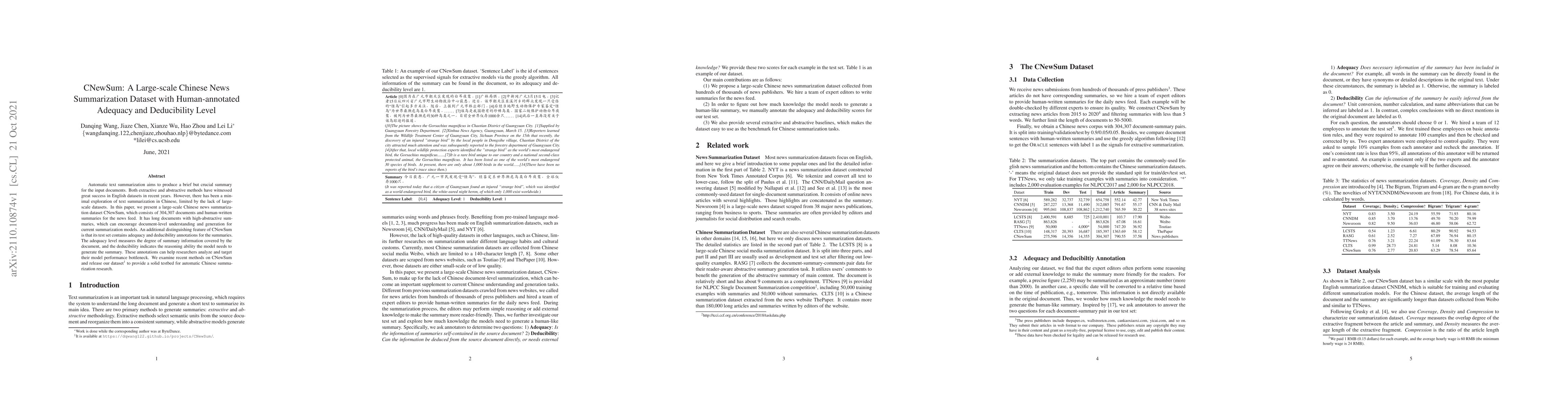 This paper introduces CNewSum, a large-scale Chinese news summarization dataset with 304,307 documents and human-written summaries, featuring annotations for adequacy and deducibility to guide model improvements in summarization research. The dataset aims to address the scarcity of large-scale Chinese summarization datasets and provide a testbed for enhancing automatic Chinese summarization models.