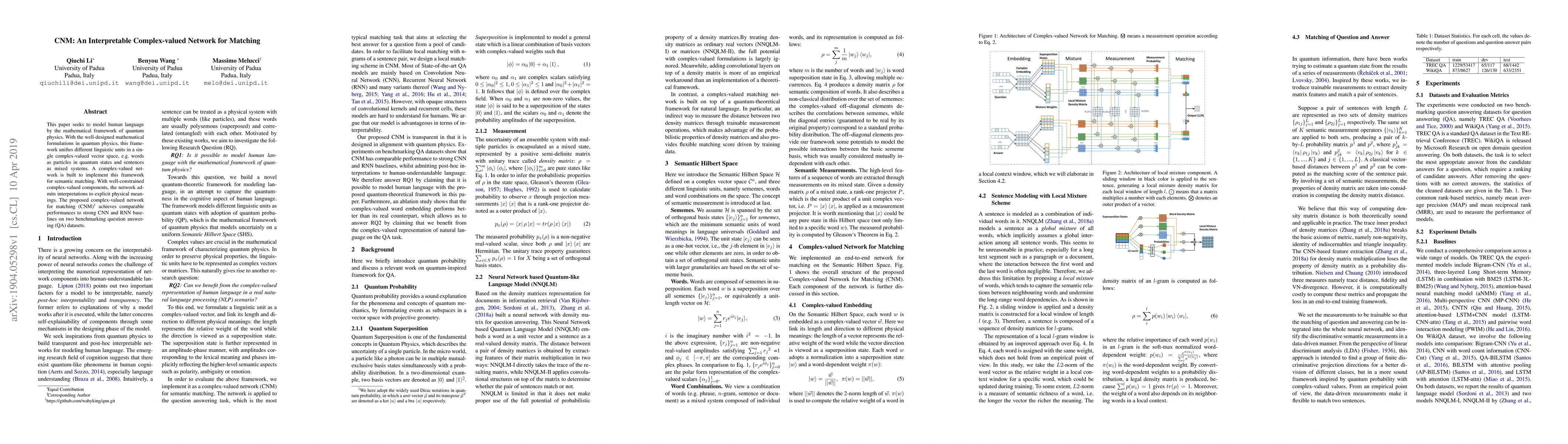 This research introduces a complex-valued network (CNM) that leverages quantum physics to model human language, unifying linguistic units in a complex vector space. The CNM demonstrates competitive performance on question-answering datasets, showcasing interpretability through its physical meaning-based components. For detailed insights, refer directly to the original paper.