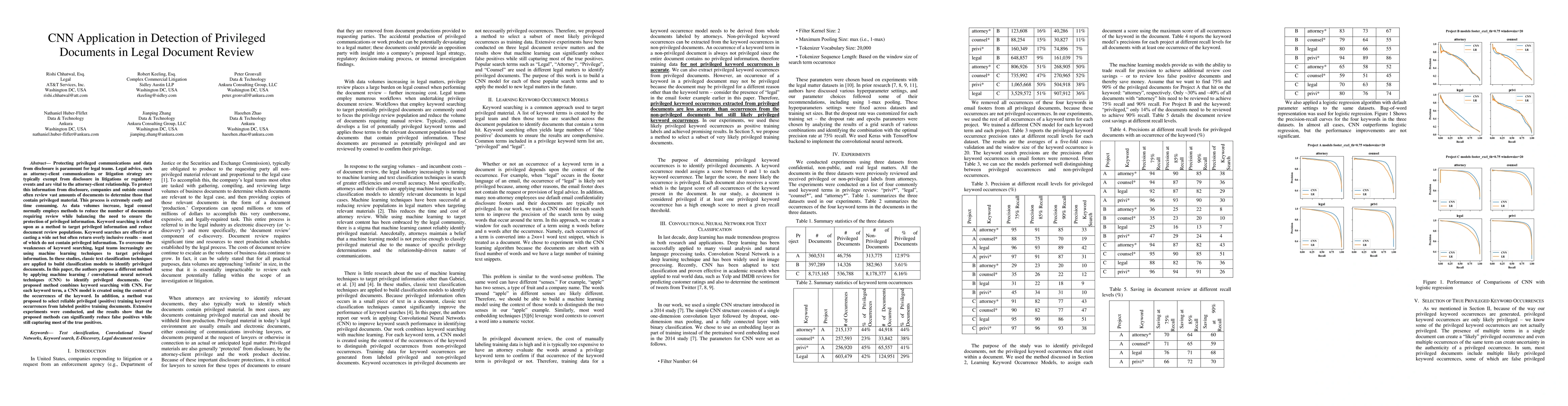Protecting privileged communications and data from disclosure is paramount for legal teams. Legal advice, such as attorney-client communications or litigation strategy are typically exempt from disclosure in litigations or regulatory events and are vital to the attorney-client relationship. To protect this information from disclosure, companies and outside counsel often review vast amounts of documents to determine those that contain privileged material. This process is extremely costly and time consuming. As data volumes increase, legal counsel normally employs methods to reduce the number of documents requiring review while balancing the need to ensure the protection of privileged information. Keyword searching is relied upon as a method to target privileged information and reduce document review populations. Keyword searches are effective at casting a wide net but often return overly inclusive results - most of which do not contain privileged information. To overcome the weaknesses of keyword searching, legal teams increasingly are using machine learning techniques to target privileged information. In these studies, classic text classification techniques are applied to build classification models to identify privileged documents. In this paper, the authors propose a different method by applying machine learning / convolutional neural network techniques (CNN) to identify privileged documents. Our proposed method combines keyword searching with CNN. For each keyword term, a CNN model is created using the context of the occurrences of the keyword. In addition, a method was proposed to select reliable privileged (positive) training keyword occurrences from labeled positive training documents. Extensive experiments were conducted, and the results show that the proposed methods can significantly reduce false positives while still capturing most of the true positives.
