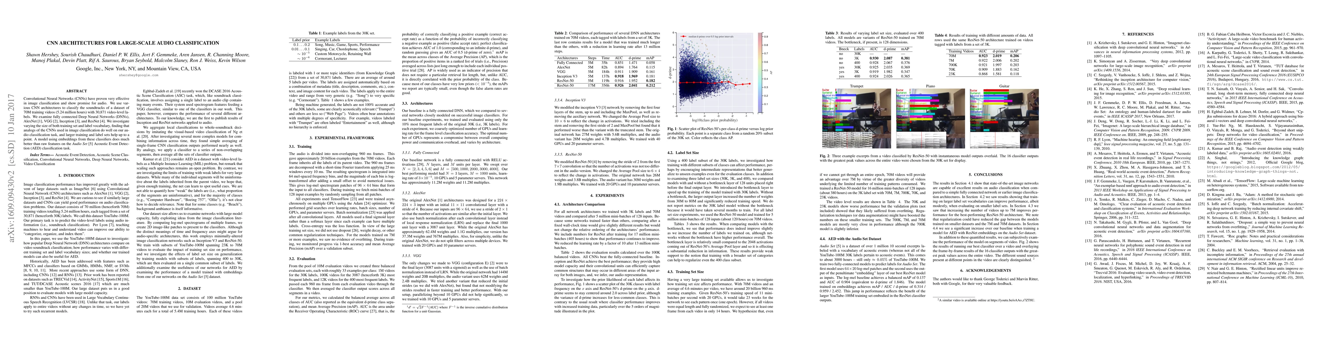 This research explores the application of various Convolutional Neural Network (CNN) architectures, including AlexNet, VGG, Inception, and ResNet, for large-scale audio classification using a dataset of 70 million training videos. The study finds that these CNN models, originally designed for image classification, are effective for audio classification, with larger training sets and label vocabularies yielding improved results. For more details, I recommend reviewing the original paper.