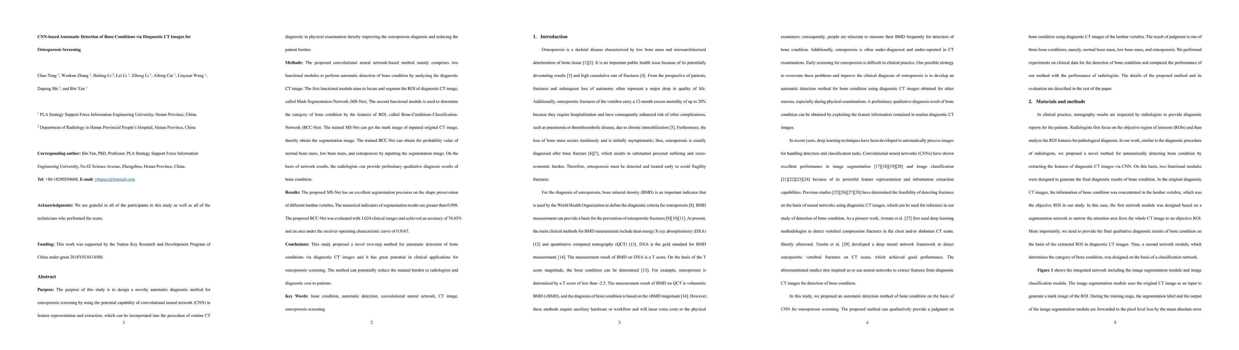 This study proposes a CNN-based method for automatic osteoporosis screening using diagnostic CT images. The method includes two modules: MS-Net for ROI segmentation and BCC-Net for bone condition classification, achieving high segmentation precision and 76.65% accuracy, potentially reducing radiologists' workload and diagnostic costs.