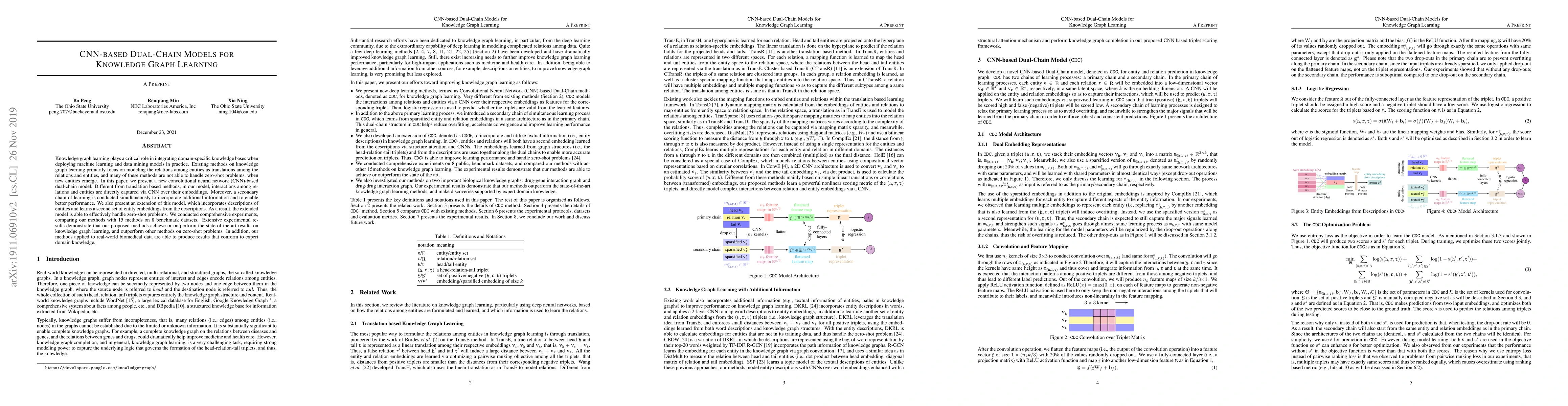 Knowledge graph learning plays a critical role in integrating domain specific knowledge bases when deploying machine learning and data mining models in practice. Existing methods on knowledge graph learning primarily focus on modeling the relations among entities as translations among the relations and entities, and many of these methods are not able to handle zero-shot problems, when new entities emerge. In this paper, we present a new convolutional neural network (CNN)-based dual-chain model. Different from translation based methods, in our model, interactions among relations and entities are directly captured via CNN over their embeddings. Moreover, a secondary chain of learning is conducted simultaneously to incorporate additional information and to enable better performance. We also present an extension of this model, which incorporates descriptions of entities and learns a second set of entity embeddings from the descriptions. As a result, the extended model is able to effectively handle zero-shot problems. We conducted comprehensive experiments, comparing our methods with 15 methods on 8 benchmark datasets. Extensive experimental results demonstrate that our proposed methods achieve or outperform the state-of-the-art results on knowledge graph learning, and outperform other methods on zero-shot problems. In addition, our methods applied to real-world biomedical data are able to produce results that conform to expert domain knowledge.
