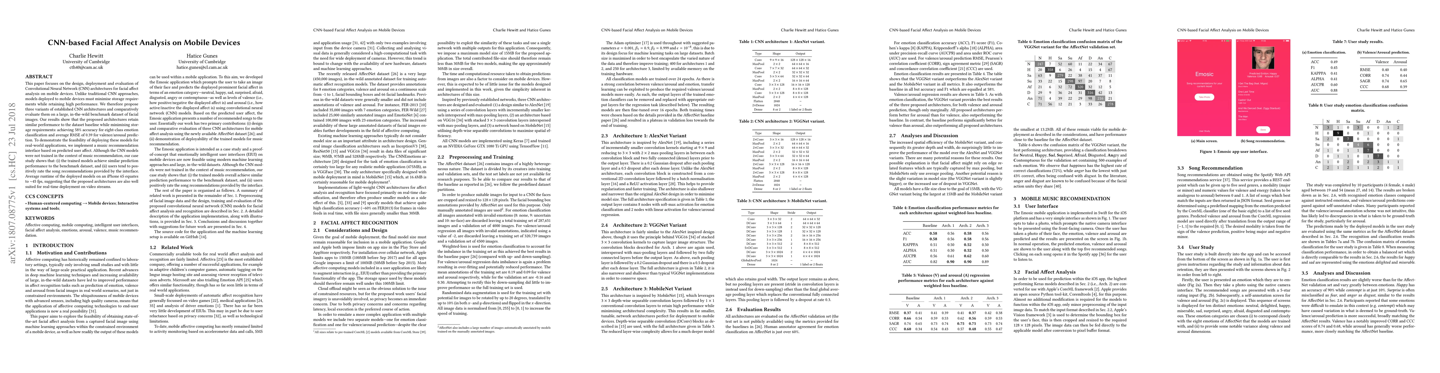 This research paper explores the design and evaluation of Convolutional Neural Network (CNN) architectures optimized for facial affect analysis on mobile devices, focusing on minimizing storage while maintaining high performance. The study proposes three CNN variants, achieving 58% accuracy for eight-class emotion classification and an average RMSE of 0.39 for valence/arousal prediction, demonstrating their potential for real-time applications like music recommendation interfaces.