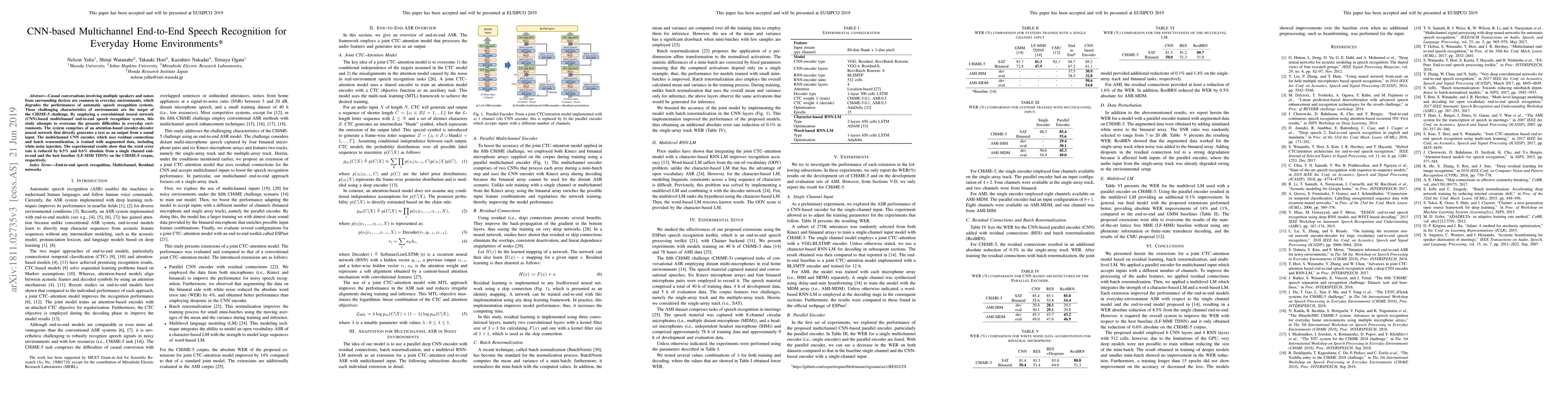 This study introduces a CNN-based multichannel end-to-end speech recognition system to improve performance in noisy, multi-speaker home environments, achieving an 8.5% and 0.6% absolute reduction in word error rate compared to single channel systems and the best baseline, respectively.