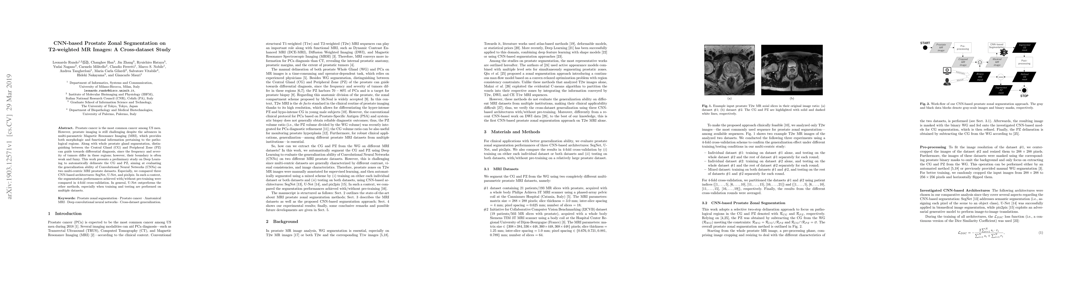 Prostate cancer is the most common cancer among US men. However, prostate imaging is still challenging despite the advances in multi-parametric Magnetic Resonance Imaging (MRI), which provides both morphologic and functional information pertaining to the pathological regions. Along with whole prostate gland segmentation, distinguishing between the Central Gland (CG) and Peripheral Zone (PZ) can guide towards differential diagnosis, since the frequency and severity of tumors differ in these regions; however, their boundary is often weak and fuzzy. This work presents a preliminary study on Deep Learning to automatically delineate the CG and PZ, aiming at evaluating the generalization ability of Convolutional Neural Networks (CNNs) on two multi-centric MRI prostate datasets. Especially, we compared three CNN-based architectures: SegNet, U-Net, and pix2pix. In such a context, the segmentation performances achieved with/without pre-training were compared in 4-fold cross-validation. In general, U-Net outperforms the other methods, especially when training and testing are performed on multiple datasets.