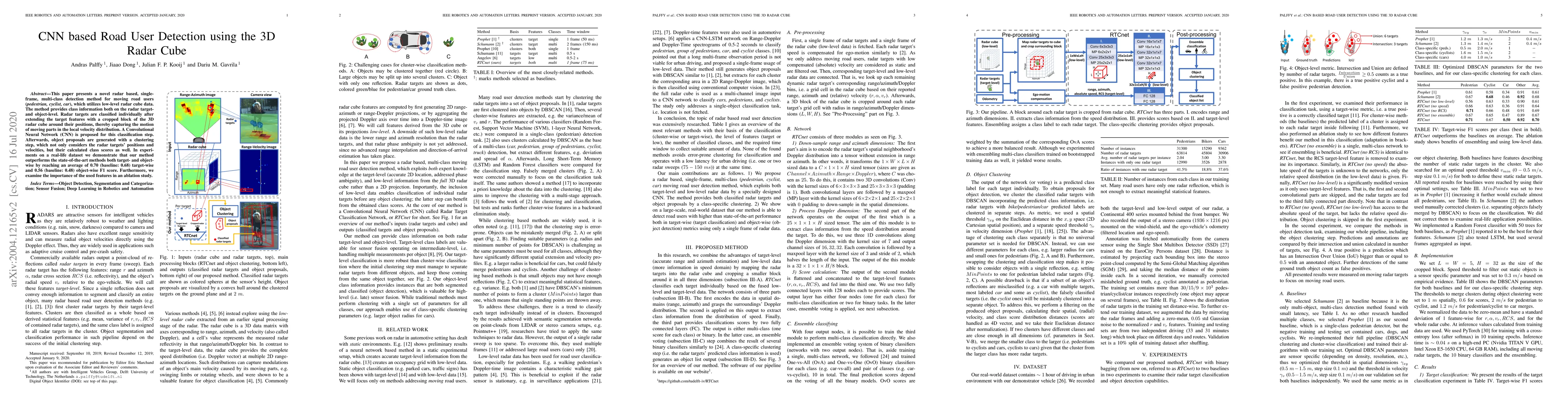This paper introduces a CNN-based method for detecting and classifying road users (pedestrians, cyclists, cars) using 3D radar cube data, achieving superior performance over existing methods with an average 0.70 target-wise F1 score. The method enhances radar target features with local velocity distributions and employs CNN for classification, followed by clustering for object proposals.