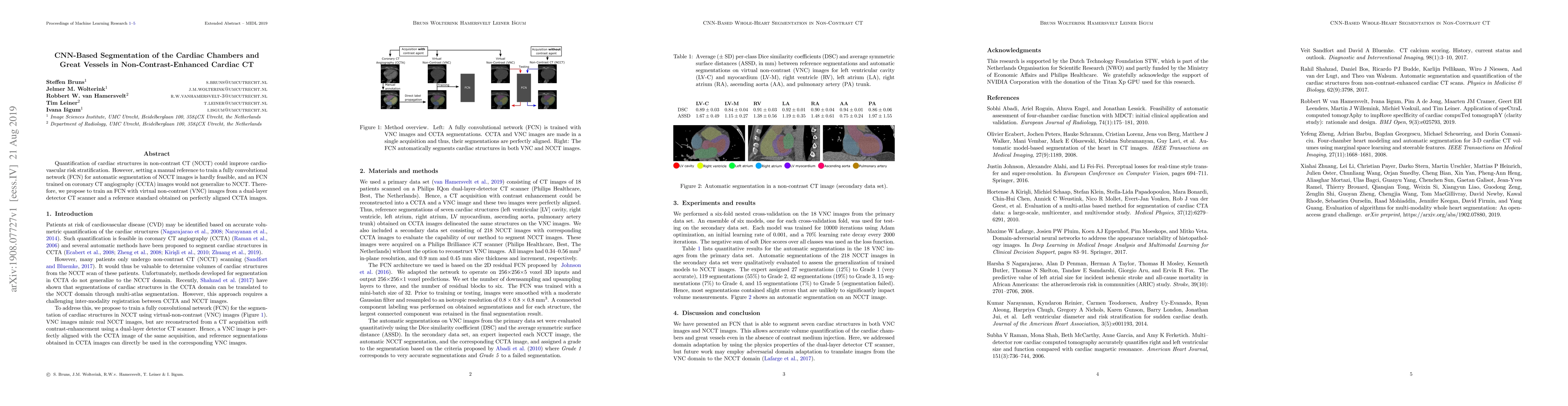 Quantification of cardiac structures in non-contrast CT (NCCT) could improve cardiovascular risk stratification. However, setting a manual reference to train a fully convolutional network (FCN) for automatic segmentation of NCCT images is hardly feasible, and an FCN trained on coronary CT angiography (CCTA) images would not generalize to NCCT. Therefore, we propose to train an FCN with virtual non-contrast (VNC) images from a dual-layer detector CT scanner and a reference standard obtained on perfectly aligned CCTA images.
