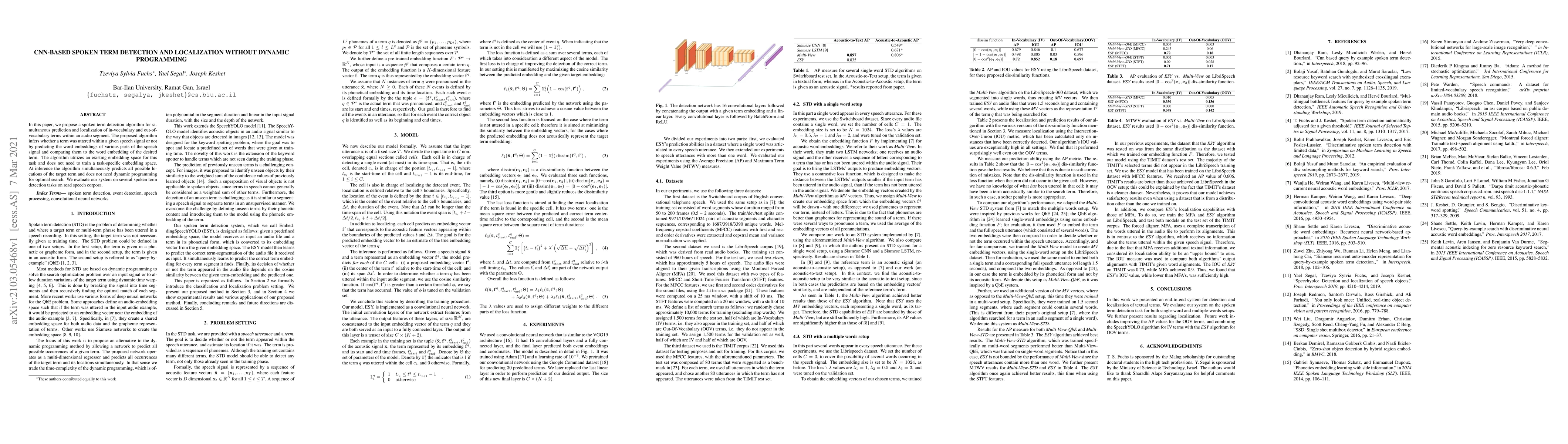 This paper proposes a CNN-based spoken term detection algorithm that predicts and localizes both in-vocabulary and out-of-vocabulary terms without dynamic programming. It uses word embeddings for comparison and evaluates its performance on read speech corpora.