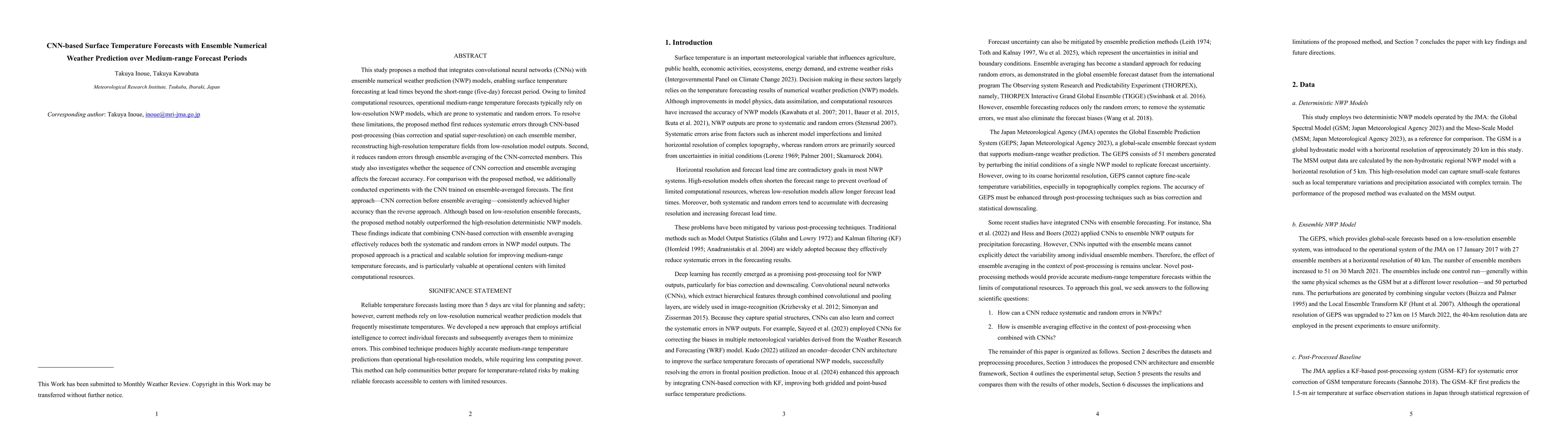 This research introduces a method combining Convolutional Neural Networks (CNNs) with ensemble numerical weather prediction (NWP) models for accurate medium-range surface temperature forecasts. The approach outperforms traditional low-resolution NWP models by correcting systematic errors via CNN-based post-processing and reducing random errors through ensemble averaging, demonstrating improved forecast accuracy with limited computational resources.