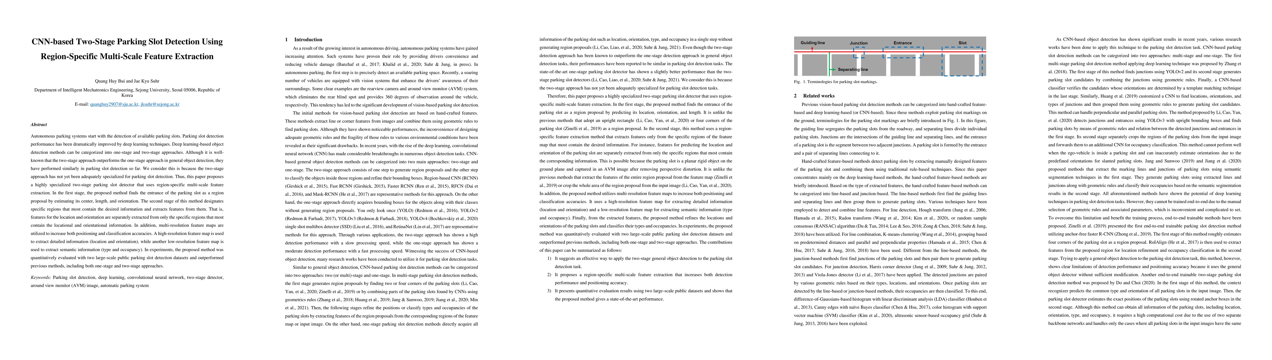 This paper proposes a specialized two-stage CNN-based parking slot detector using region-specific multi-scale feature extraction, outperforming previous methods in both positioning and classification accuracy on large-scale datasets. The method extracts detailed and semantic features from specific regions to enhance detection performance.