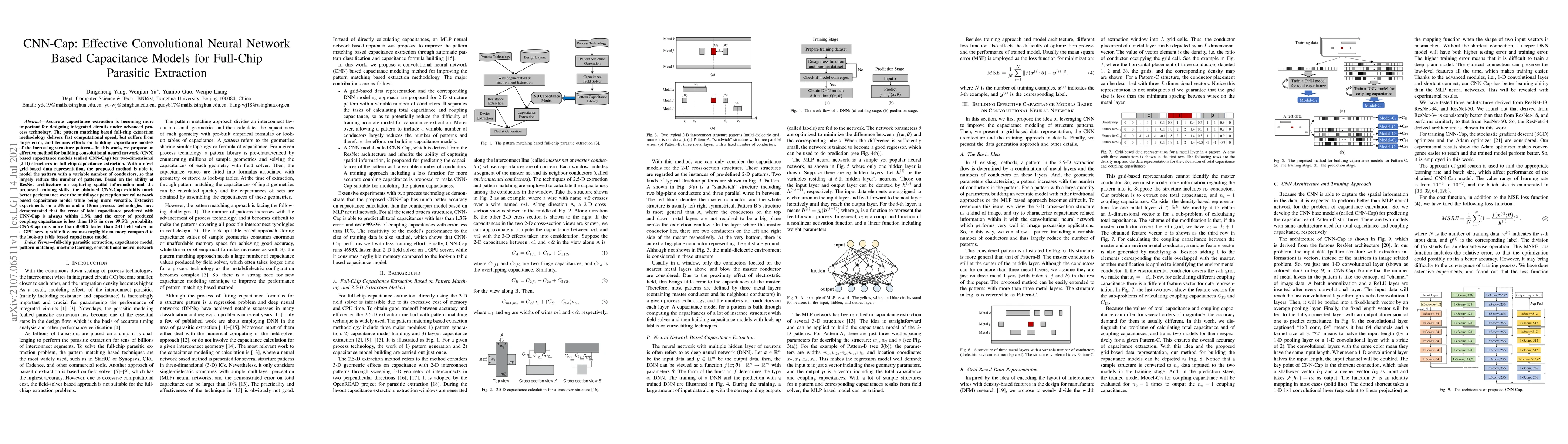 Accurate capacitance extraction is becoming more important for designing integrated circuits under advanced process technology. The pattern matching based full-chip extraction methodology delivers fast computational speed, but suffers from large error, and tedious efforts on building capacitance models of the increasing structure patterns. In this work, we propose an effective method for building convolutional neural network (CNN) based capacitance models (called CNN-Cap) for two-dimensional (2-D) structures in full-chip capacitance extraction. With a novel grid-based data representation, the proposed method is able to model the pattern with a variable number of conductors, so that largely reduce the number of patterns. Based on the ability of ResNet architecture on capturing spatial information and the proposed training skills, the obtained CNN-Cap exhibits much better performance over the multilayer perception neural network based capacitance model while being more versatile. Extensive experiments on a 55nm and a 15nm process technologies have demonstrated that the error of total capacitance produced with CNN-Cap is always within 1.3% and the error of produced coupling capacitance is less than 10% in over 99.5% probability. CNN-Cap runs more than 4000X faster than 2-D field solver on a GPU server, while it consumes negligible memory compared to the look-up table based capacitance model.